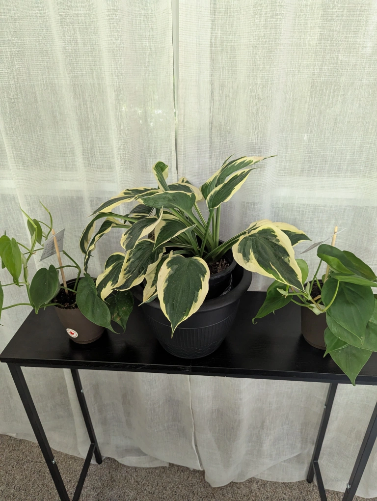 Three house plants, one plantain lily and two philodendron, all in excellent condition.