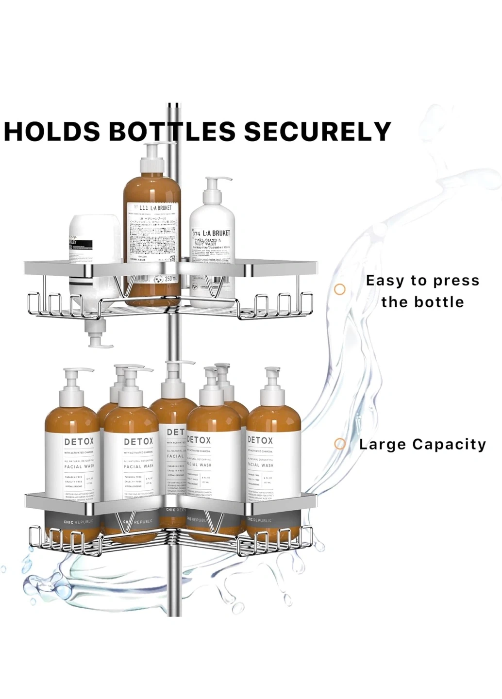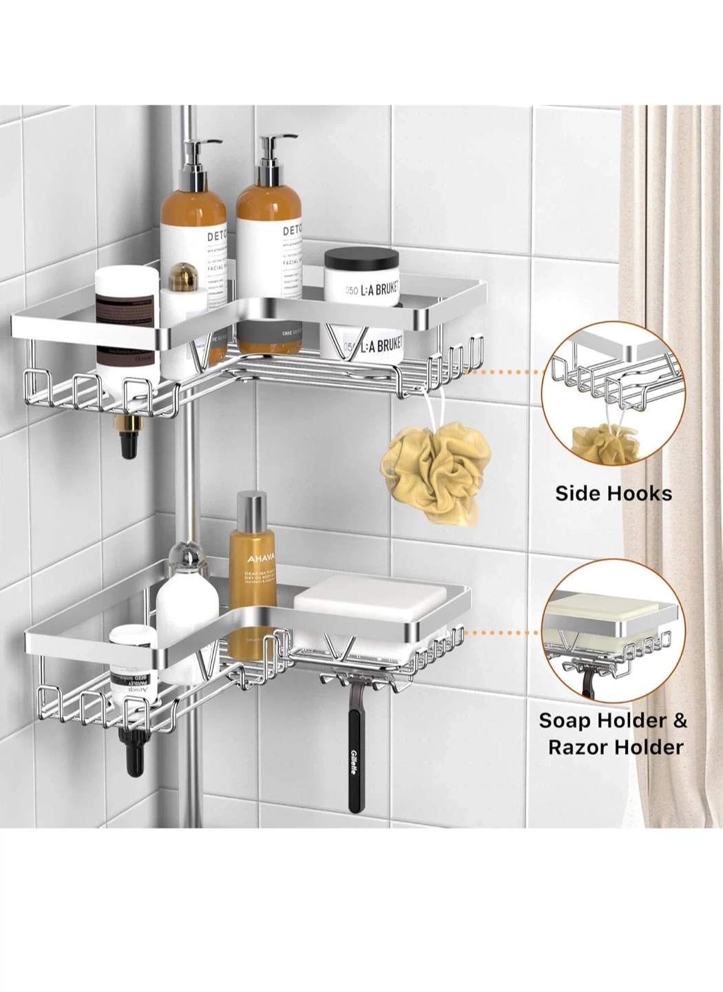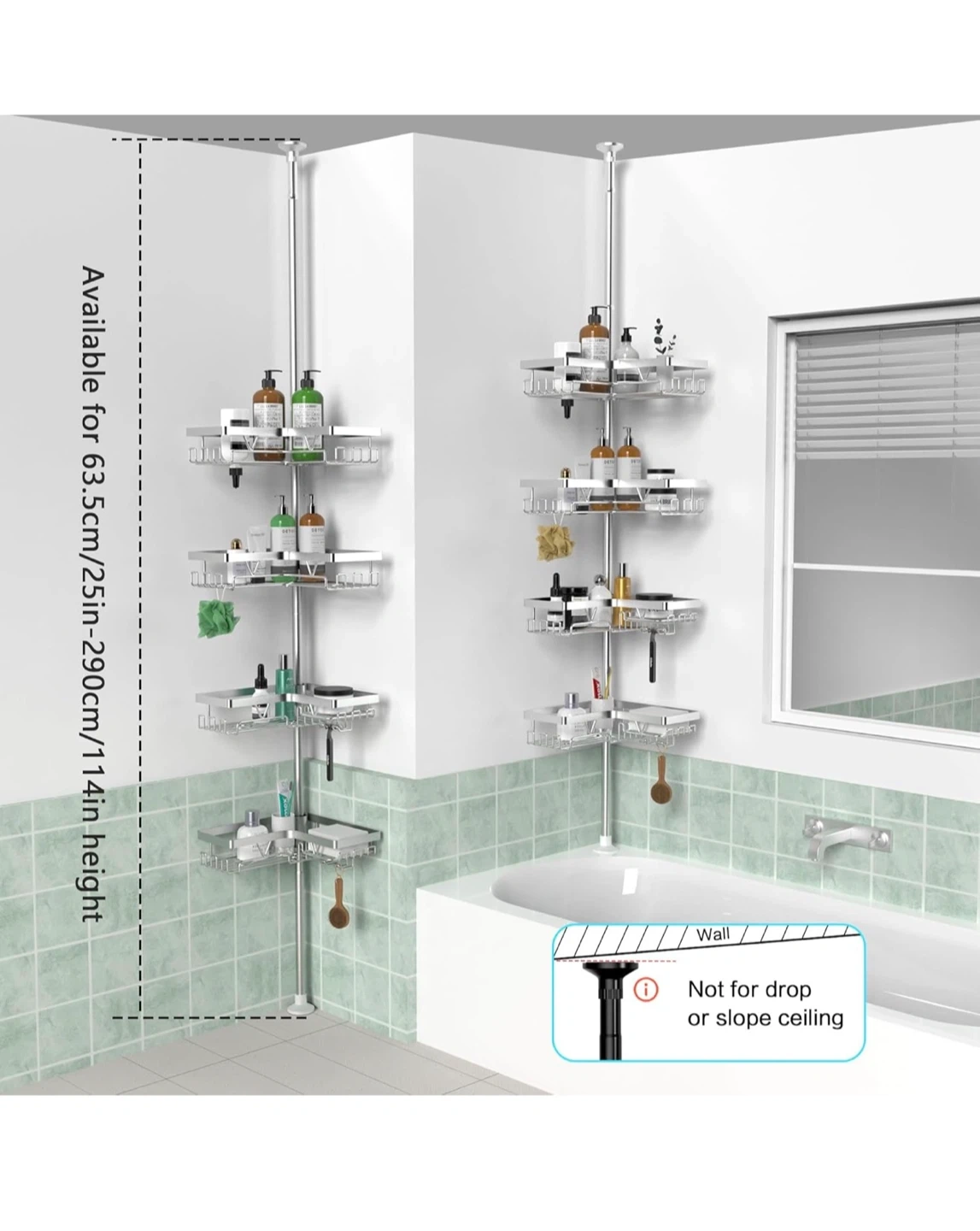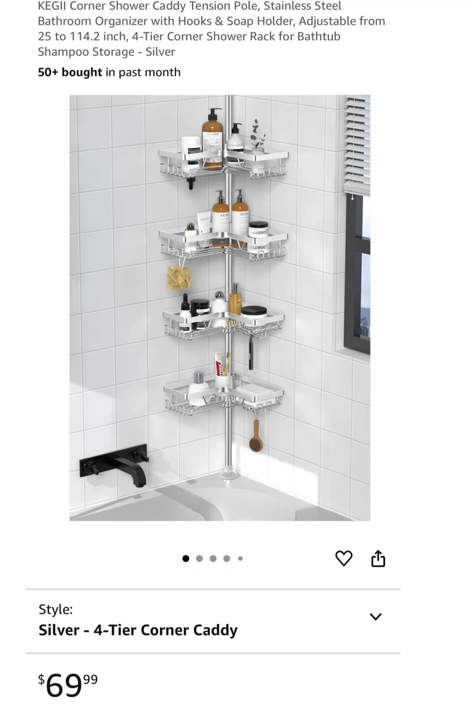 Keep your shower organized with this KEGII corner shower caddy! It's a 4-tier tension pole caddy with hooks and a soap/razor holder. It's adjustable from 25 to 114.2 inches. Retails for $69.99