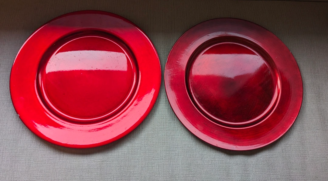 Selling a set of two charger plates in a vibrant red colour. They are perfect for adding a touch of elegance to your dining table or special occasions. They're in great condition and ready to be used for your next dinner party!
