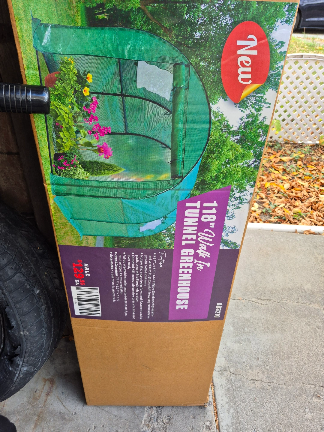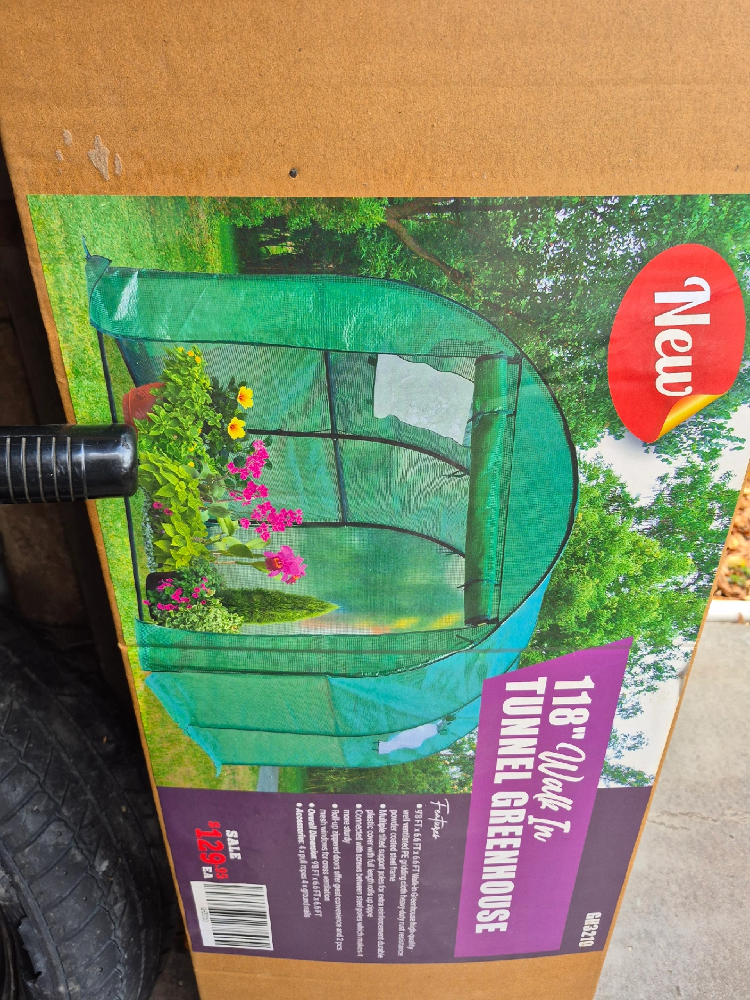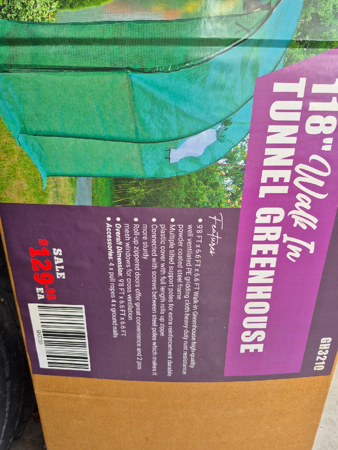 This is a new 118" Walk In Tunnel Greenhouse. It features a 9.8 FT x 6.6 FT x 6.6 FT walk-in greenhouse, high-quality, well-ventilated PE grid cover, and heavy-duty rust-resistant powder-coated steel frame. It has multiple tilted support poles for extra reinforcement and a plastic cover with full-length roll-up zips. The overall dimensions are 9'8 FT x 6'6 FT x 6'6 FT and it comes with 4 pull ropes and 4 ground nails. It was originally on sale for $129.95