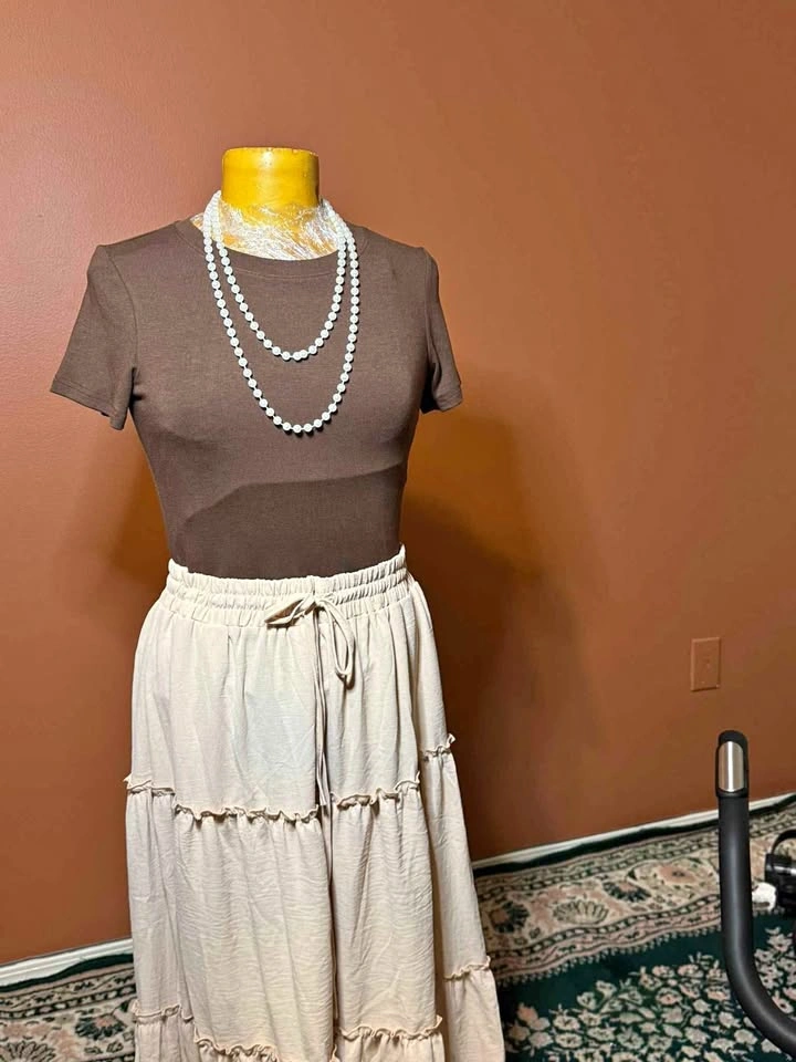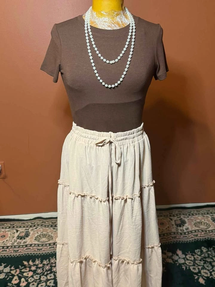 Brand NEW full outfit โ style meets comfort: ๐ Cream ribbed top (Size M) โ flattering stretch fit ๐ Bronze silky tiered skirt (Size M) โ soft, flowy & elegant ๐ Zhoea faux-leather loafers (Size 6 โ available in other sizes too) โ classic gold buckle detail Effortlessly chic for work, brunch, or everyday glam Bundle for just $45 (Value over $100!) Add the double-layer pearl necklace for only $5 extra Pickup in Mission (Centennial Park area) Feel free to message if you have any questions!