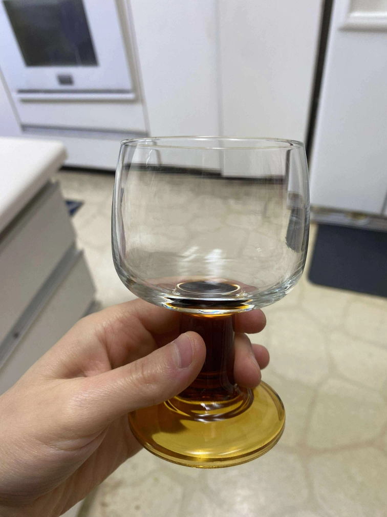 Selling a set of 5 unique wine glasses. These glasses have a clear body with a distinctive amber-coloured base and stem. They are new and would make a lovely addition to any home bar or dining set