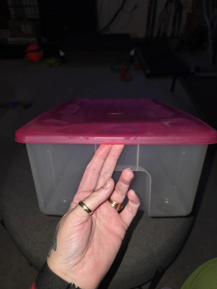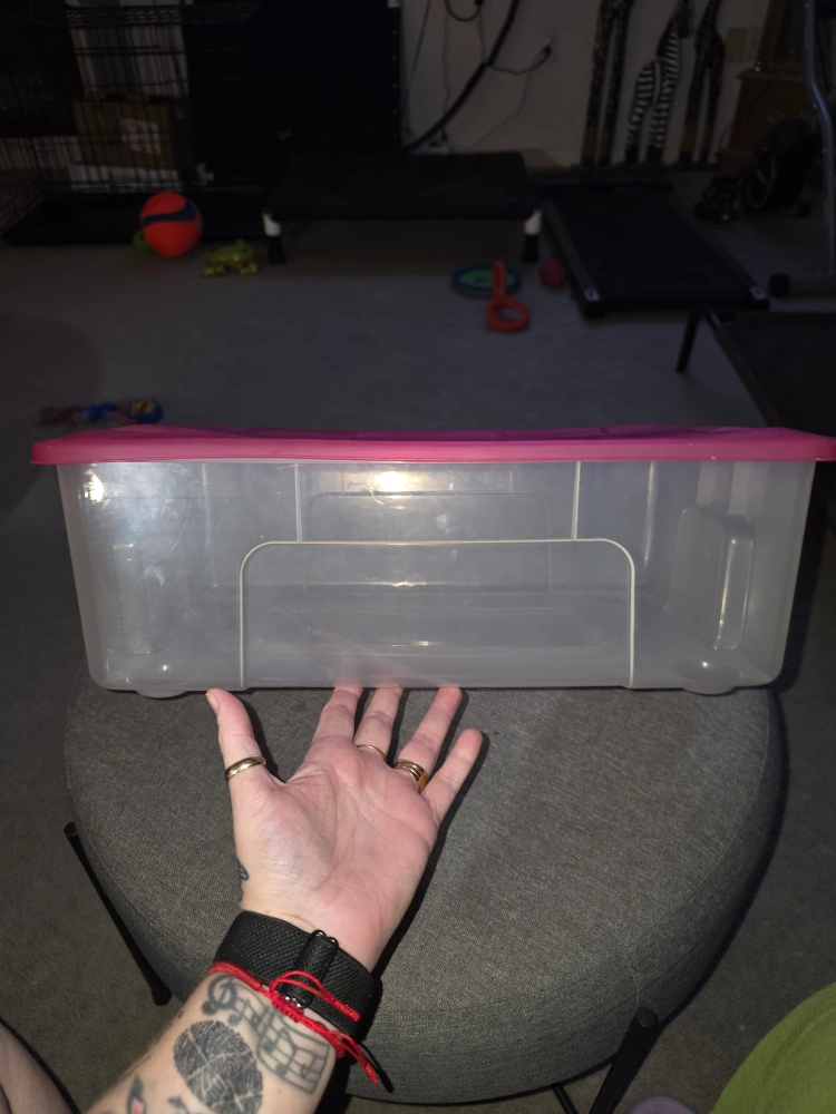 Storage bin 18 inches long ( left to right) about 6 in tall and about 12 in( front to back)