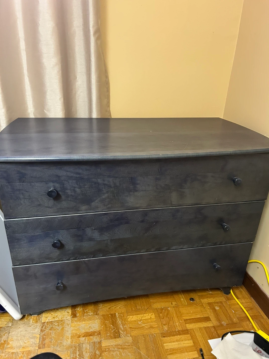Morigeau Lépine Navy blue dresser. The brand is known for its durable, solid wood construction and deep, sturdy drawers. Back feet missing so it is not level but can be fixed if you are handy to add wood to level.