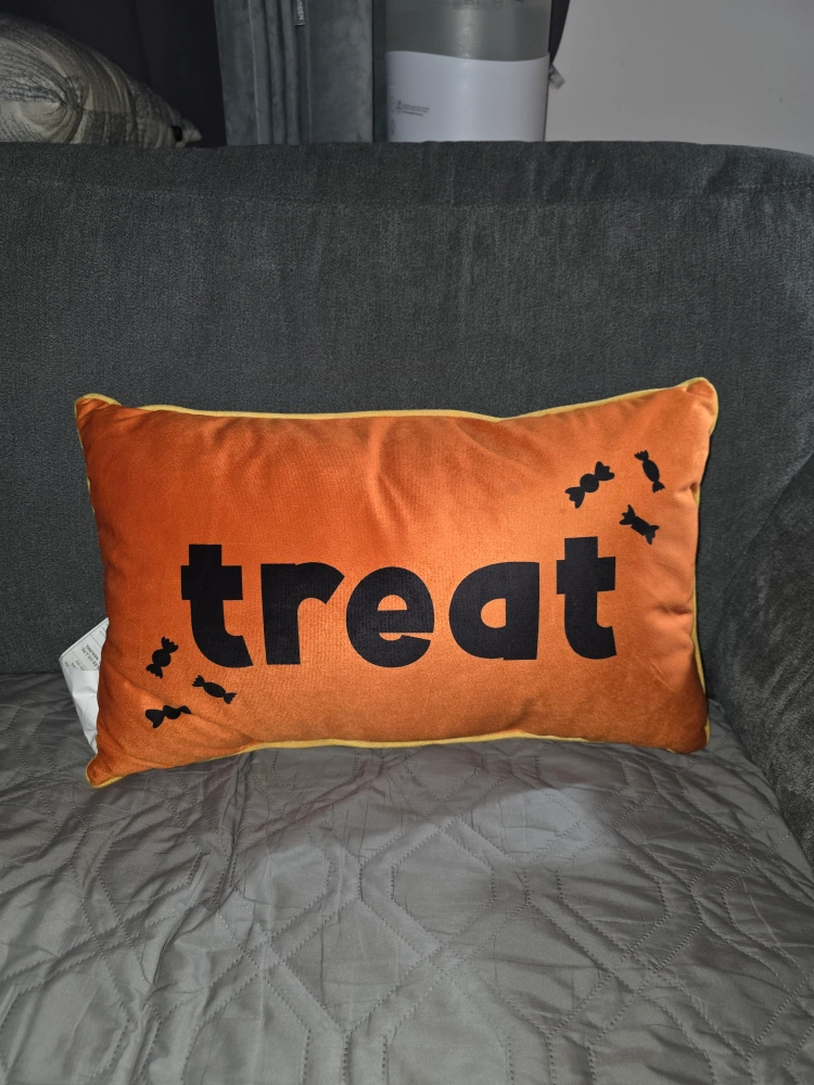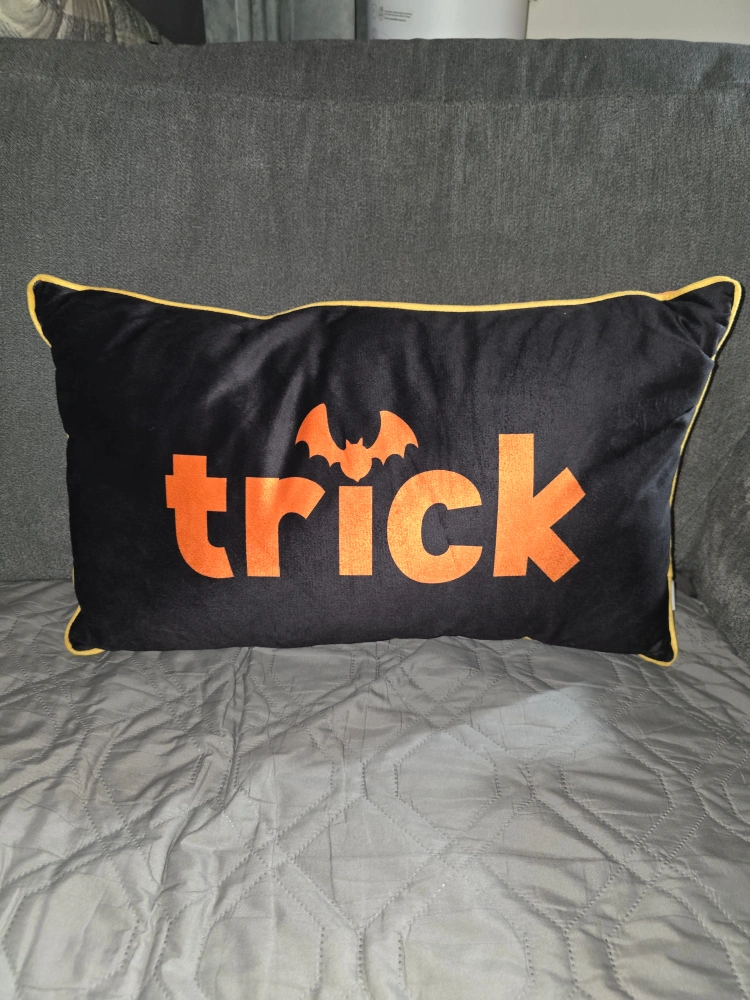 Cute decorative pillow for Halloween treat on one side trick on the other About 18 in Long and about 11 in tall