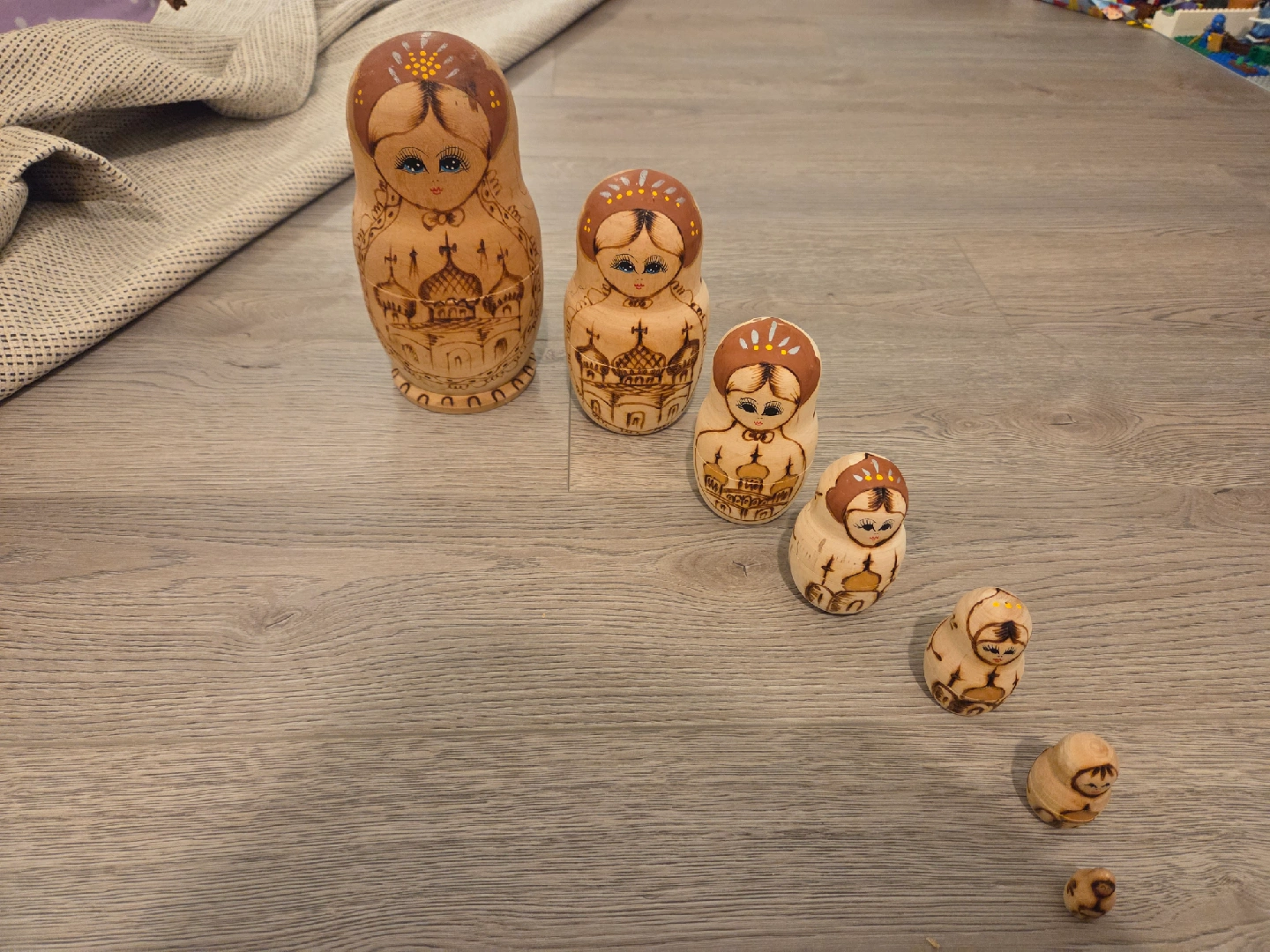 Selling a set of wooden Matryoshka nesting dolls. These are hand-painted with traditional designs and are in good condition. A charming addition to any collection or a unique decorative piece!
