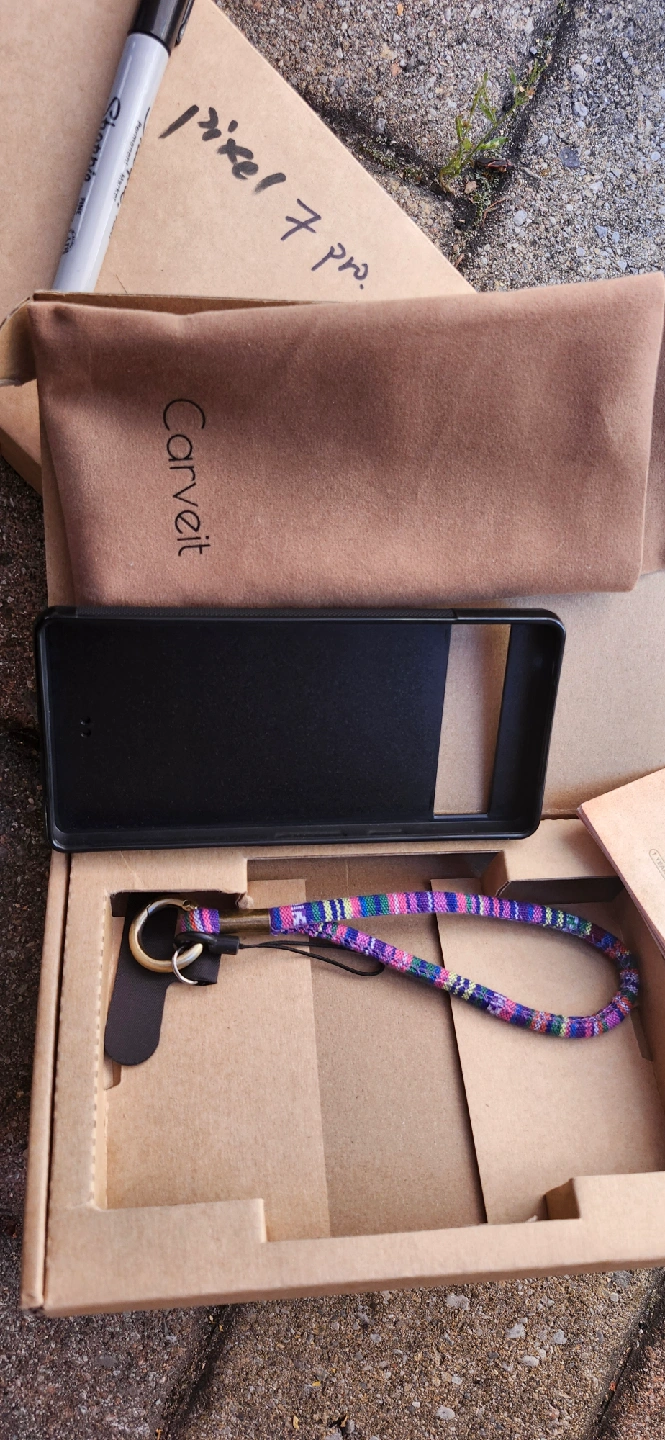 Selling a Carved phone case for a Pixel 7 Pro! It comes with a colourful strap and a soft pouch. The case itself has a beautiful carved design on the back. Comes with the original box too