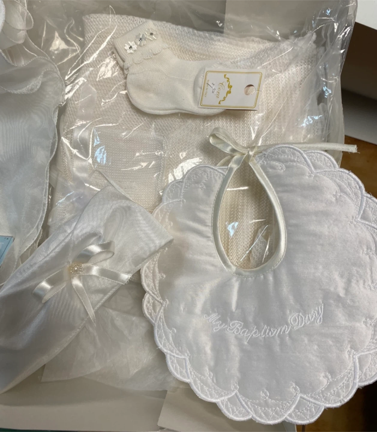 This is a complete Baptism outfit set for Baby Girl. Includes the dress, the shoes, the Hat, Matching socks, Bib, and Blanket. Used only once.