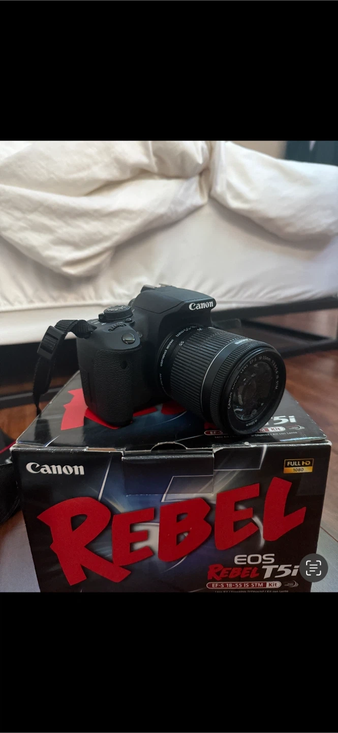 Selling a Canon EOS Rebel T5i DSLR camera. It comes with the EF-S 18-55 IS STM kit lens and the original box. Great for photography enthusiasts! Come with extra one high zoom lens, Caring bag, manual and DVD videos how to use and polarized lens covers.