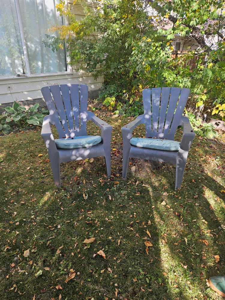 Six grey plastic outdoor chairs with light blue cushions. Perfect for your backyard or patio! Need a good cleaning but in good condition