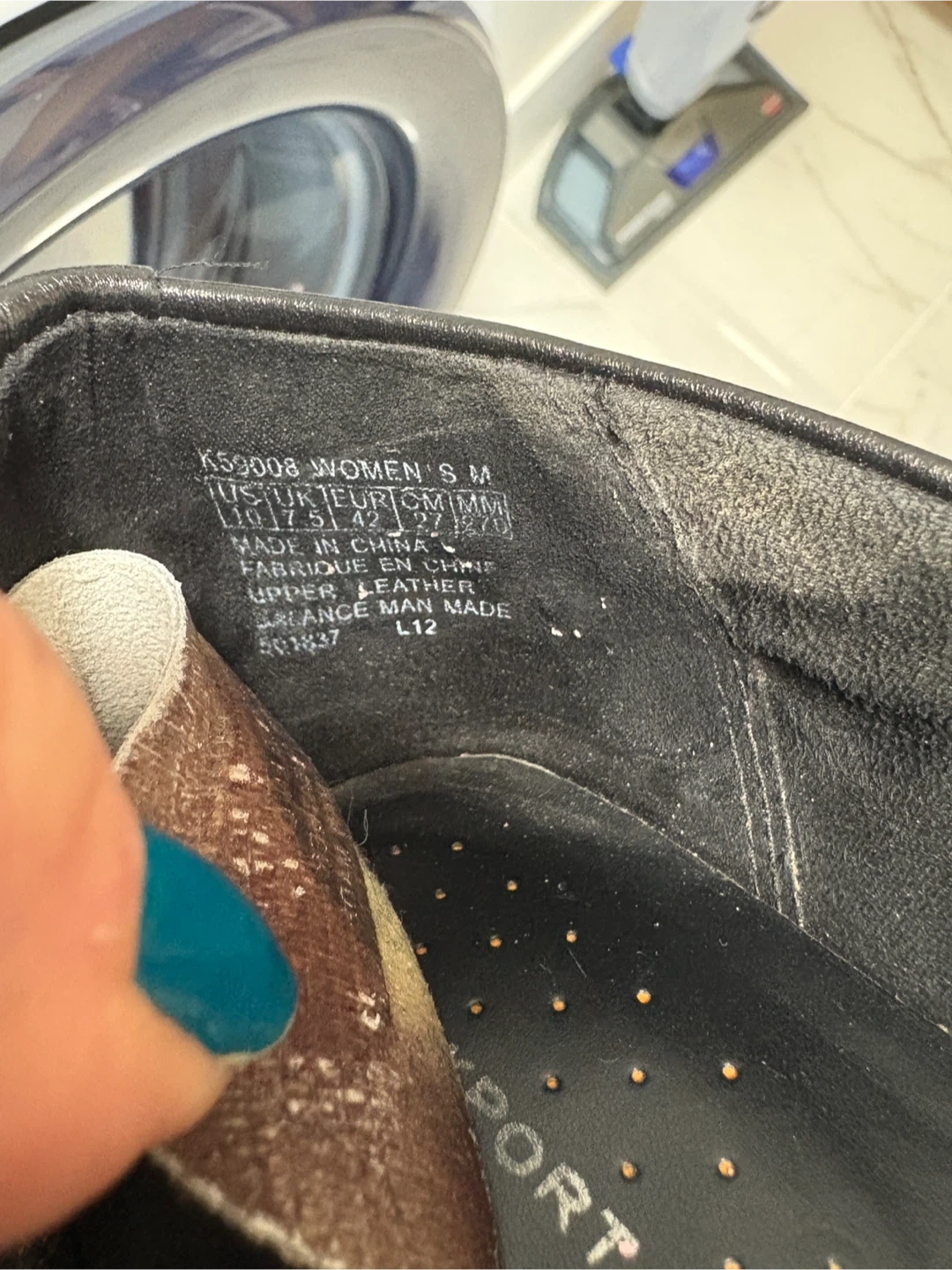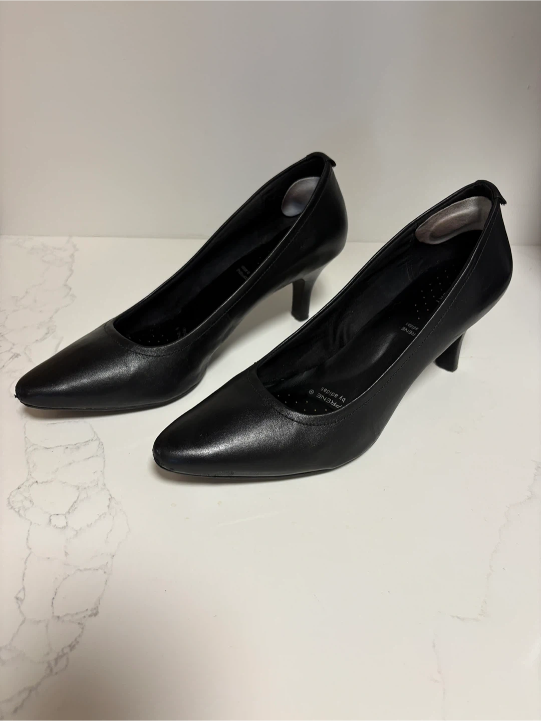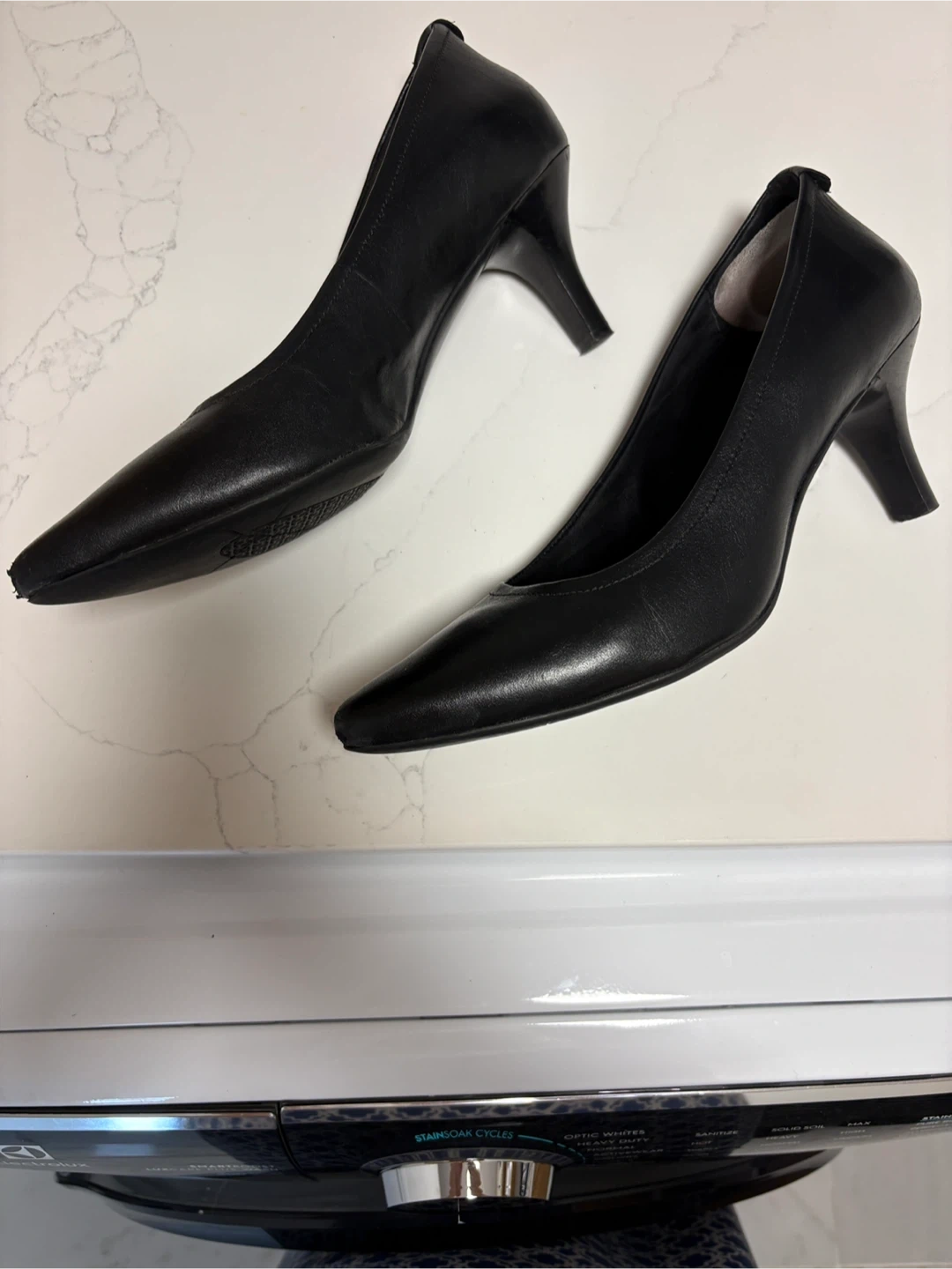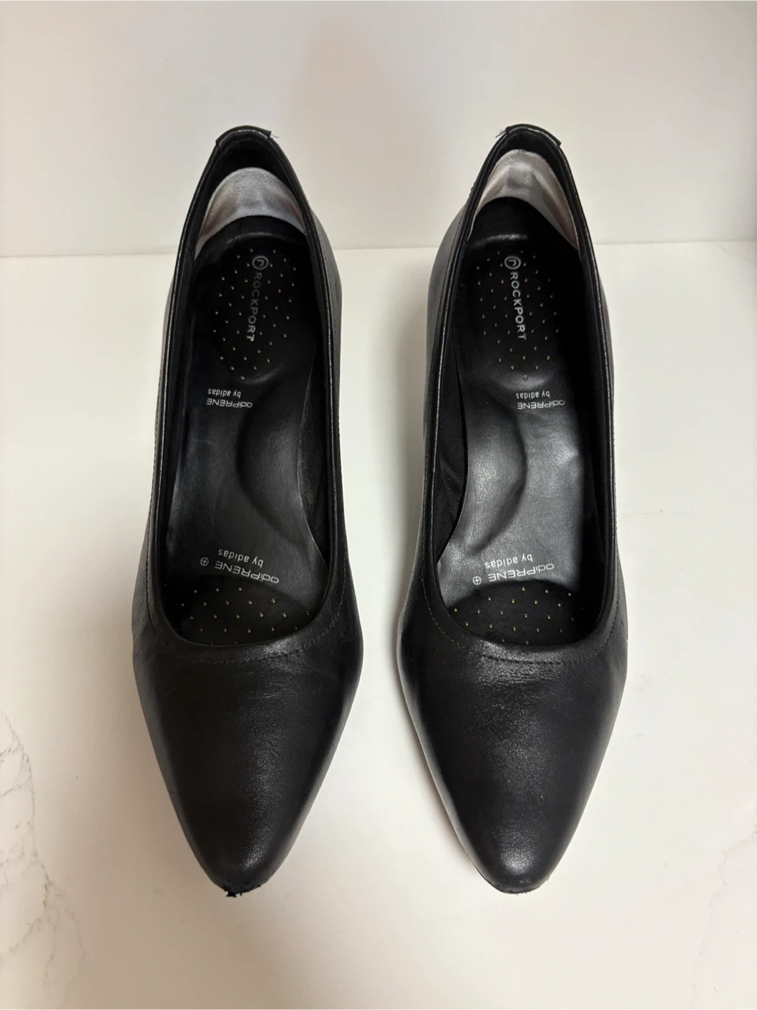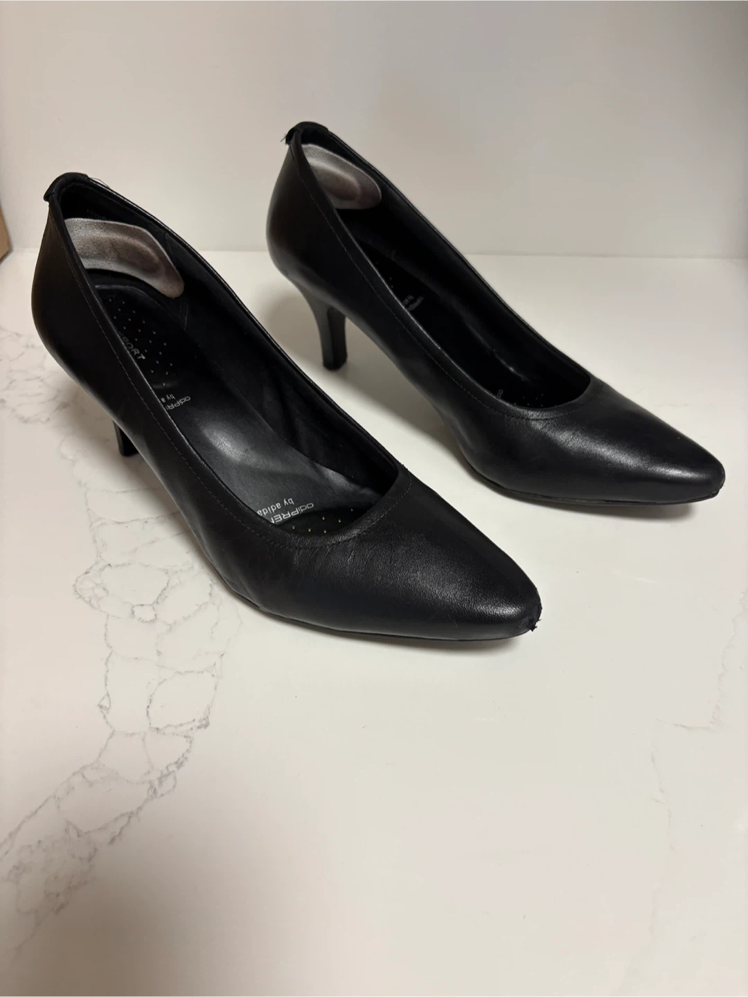 Leather & Extremely comfortable!!! These heels feature ADIPRENE by Adidas for extra comfort. Perfect for work. Will fit a 10 or even a 9.5W