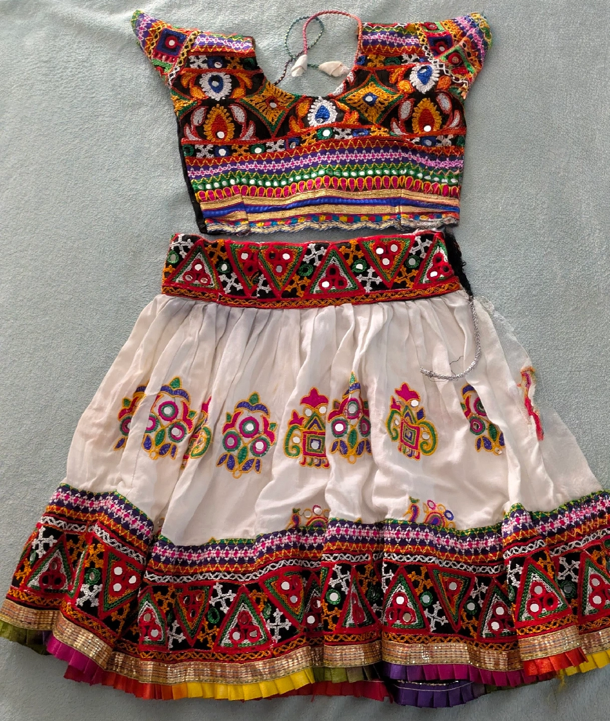 Beautiful and vibrant lehenga choli set! This traditional Indian outfit features intricate embroidery and mirror work. Perfect for a special occasion or cultural event. The skirt is a flowy white, and the top is a colourful pattern. It's in great condition and ready for a new home