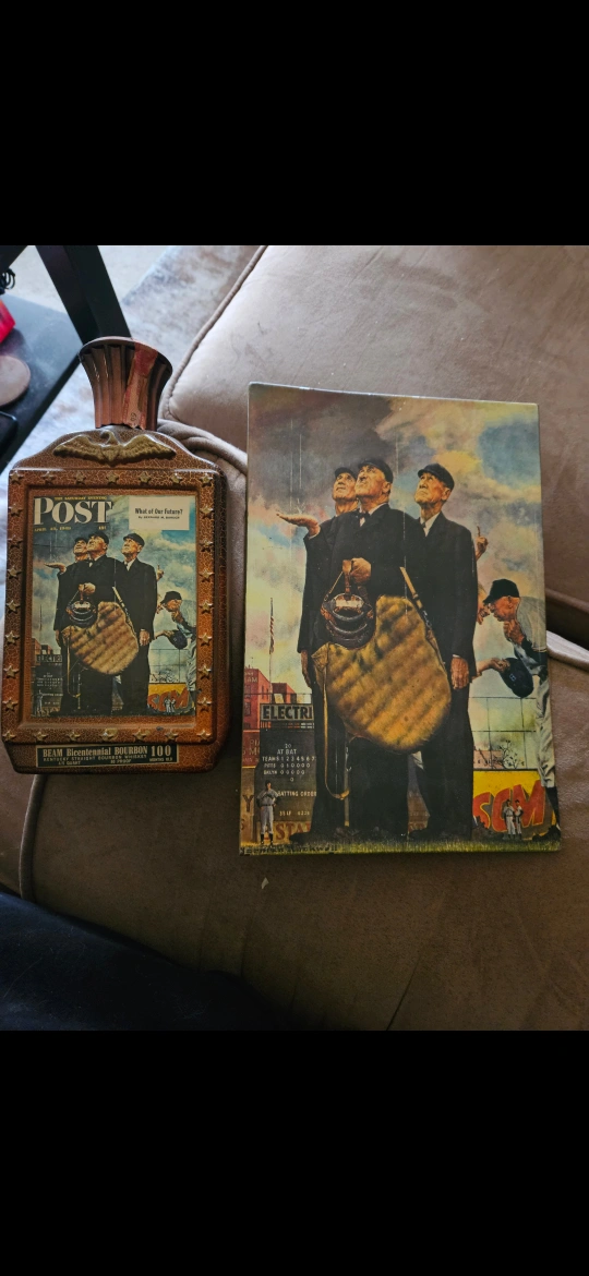 Selling a Beam Bicentennial Bourbon 100 decanter featuring a Norman Rockwell image, along with a plaque also featuring the same image. Great for collectors!