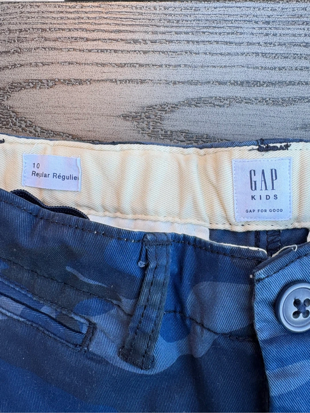 Selling a pair of Gap Kids pants in size 10. They feature a cool blue camo pattern and are in great condition.