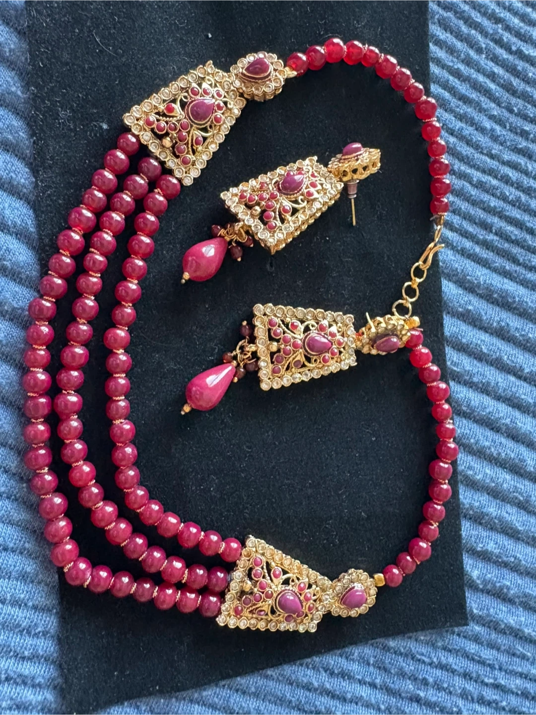 Beautiful maroon beaded necklace with matching earrings! One earring was broken during shipping, but I fixed it. You can see it in the picture.