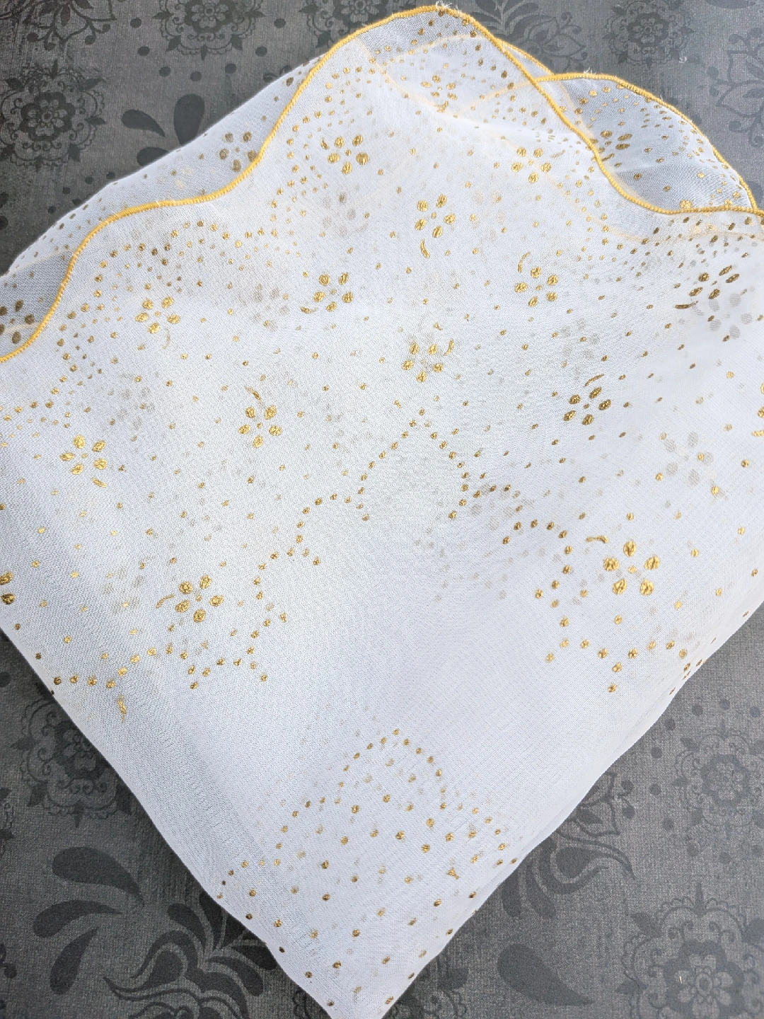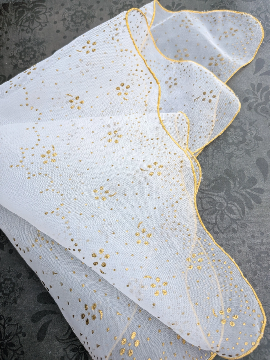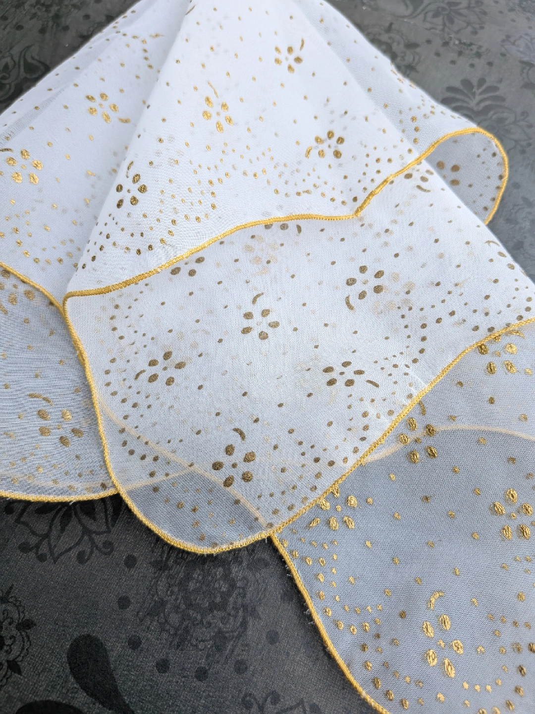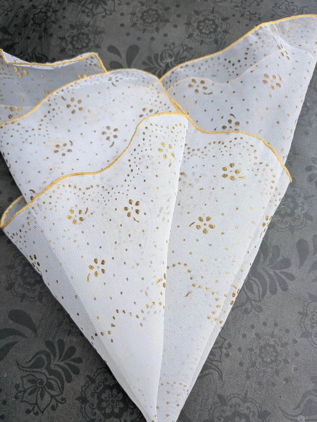 Selling a lovely sheer handkerchief from the 1950's era. It's a light white colour with gold polka dots and a gold trim. Not new, but fairly good condition with long faint snag along the middle. A little hard to see. Please see close up photos for details Discounts for multiple items purchases Cash only, no etransfers Location: Etobicoke. Rathburn Rd and Renforth dr. Etobicoke Olympium nearby