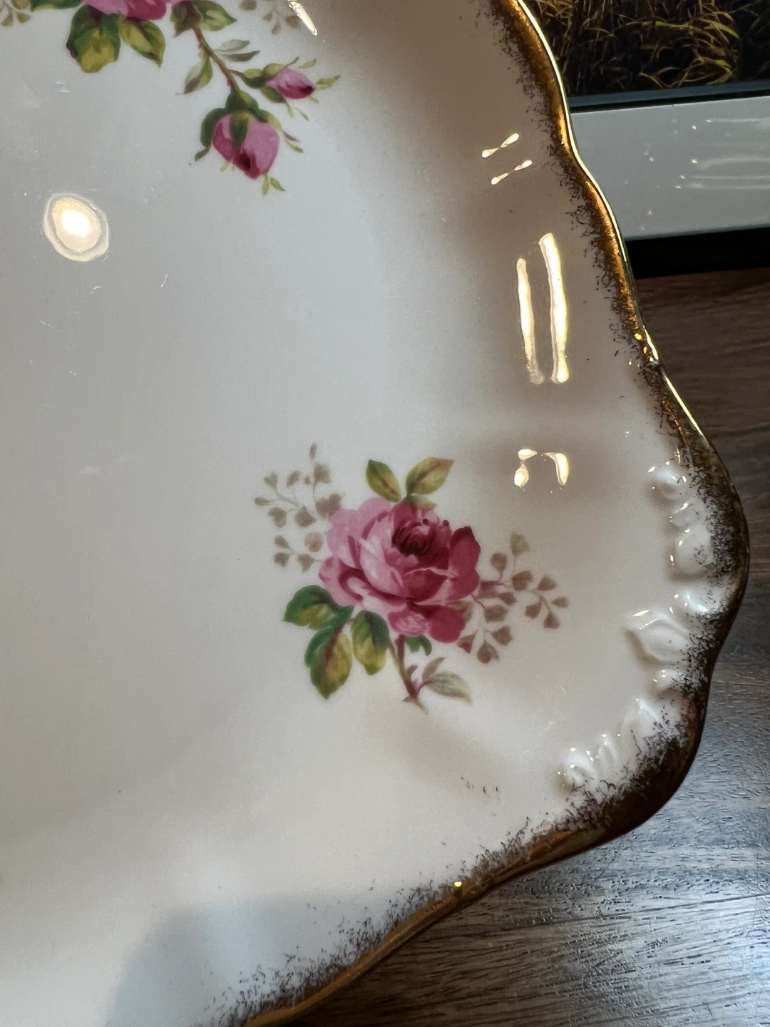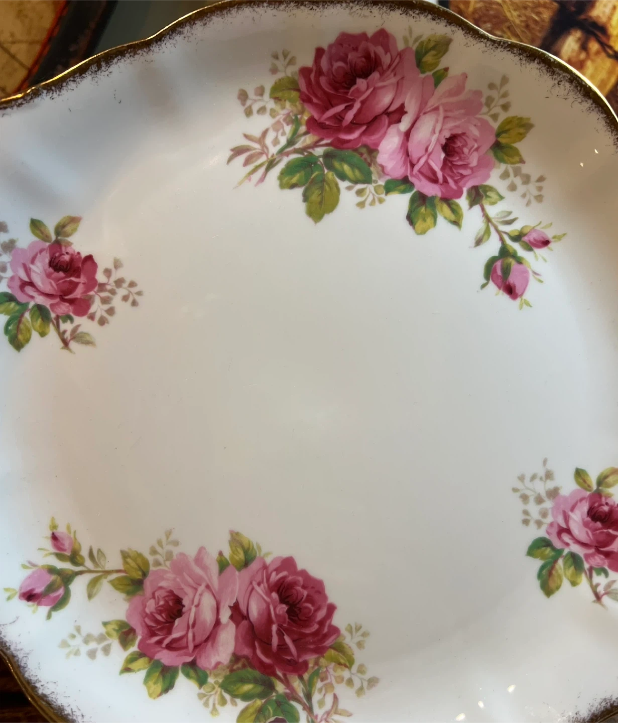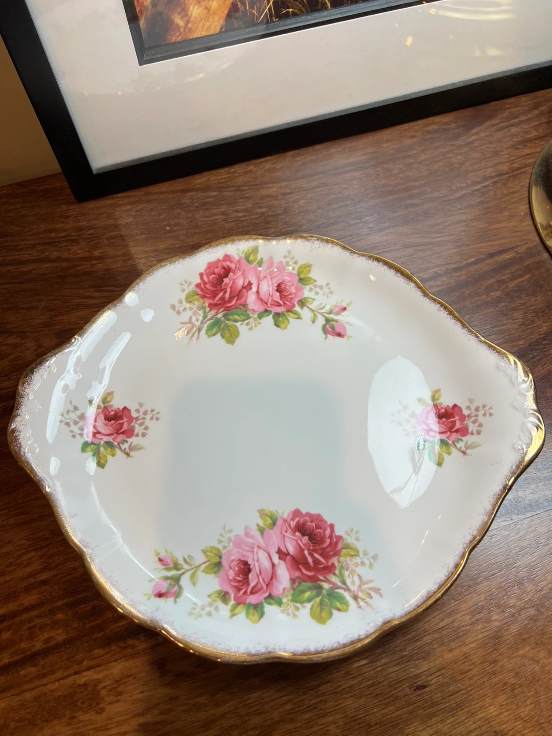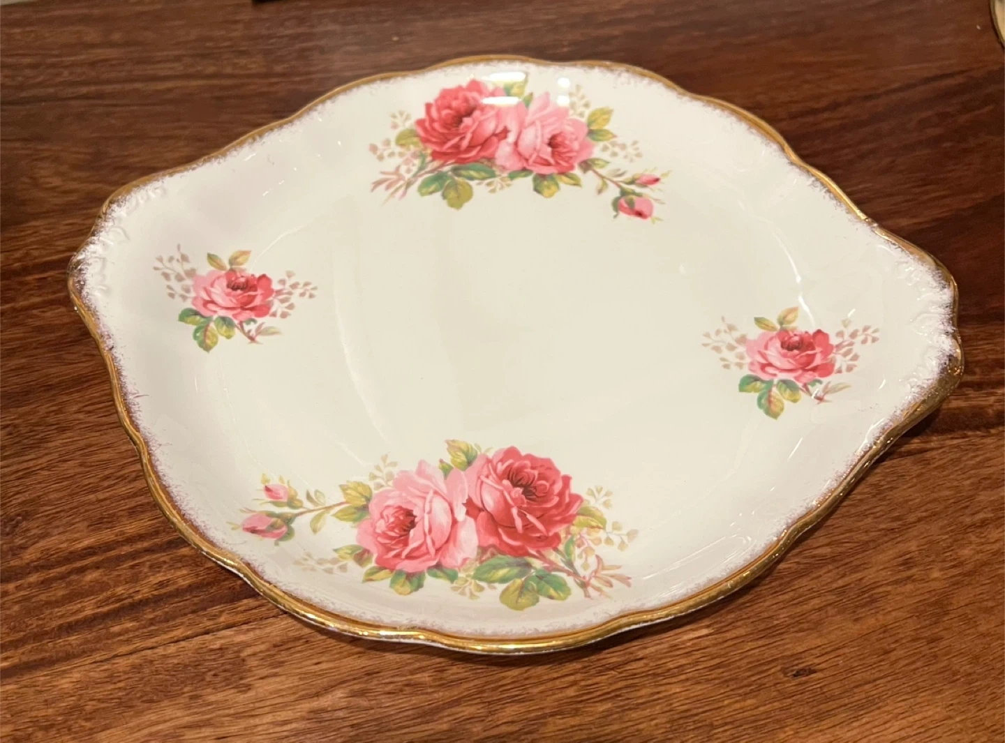Cake or serving plate with handles “American Beauty” by Royal Albert Amazing condition Scalloped rim with brushed gold trim and big lovely pink roses Handles 10.5” x 9” Ready to grace your table!!! Asking $20 Interested? Message me and please check my other listings…