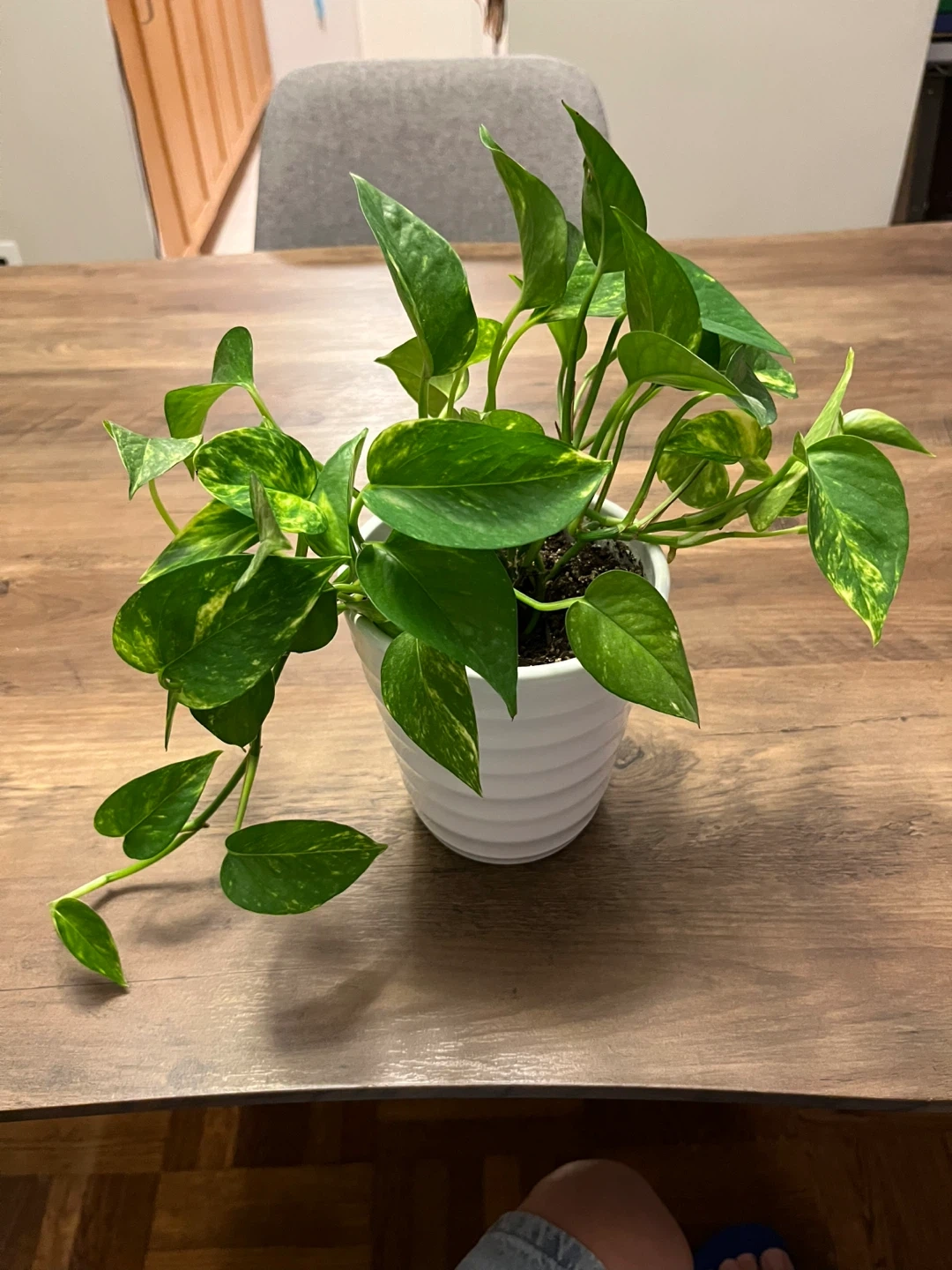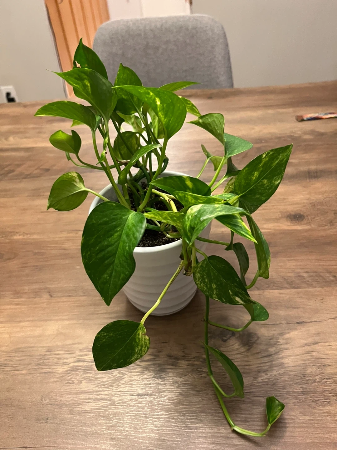 Selling a healthy golden pothos plant in a white pot! It's a beautiful addition to any home and easy to care for. The plant has vibrant green and yellow leaves and is ready to brighten up your space