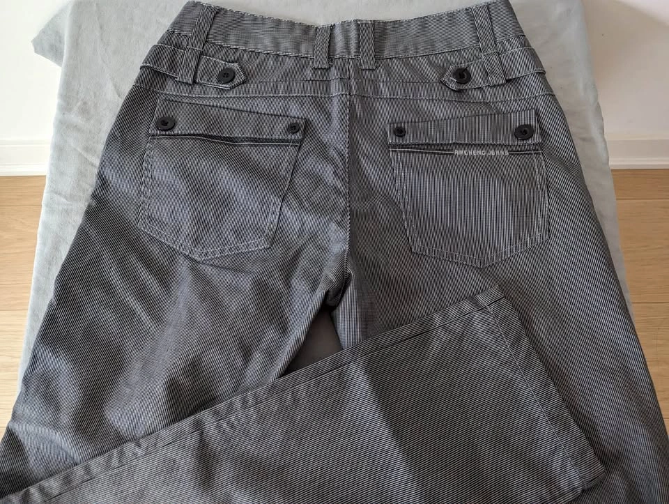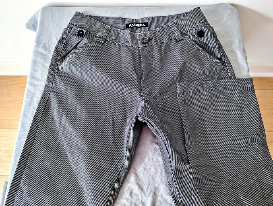 Size 28 or Size 4 (fits smaller because it doesn't have stretch), has dress pants texture. Waist 36 cm (14.2 in) Hip 47 cm (18.5 in) Waist->Crotch 26 cm (10.2 in) Pant Length 100 cm (39.4 in)