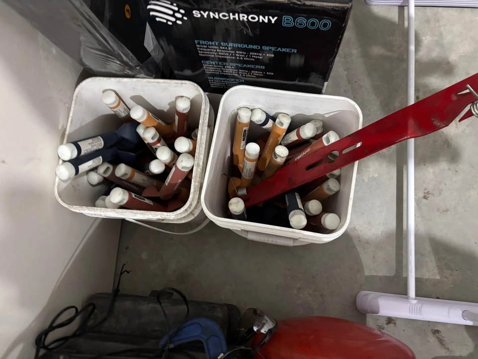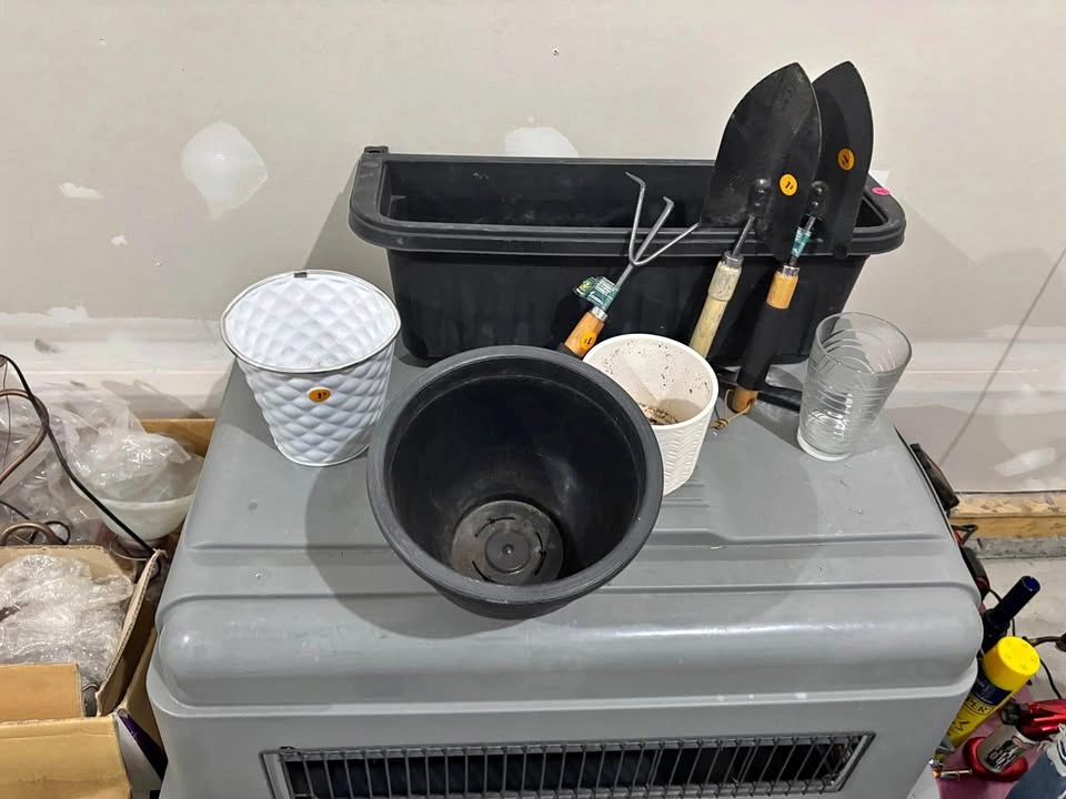 Shovels new been sitting in she'd 30 gardening she else in bins and 3 metal ones pots