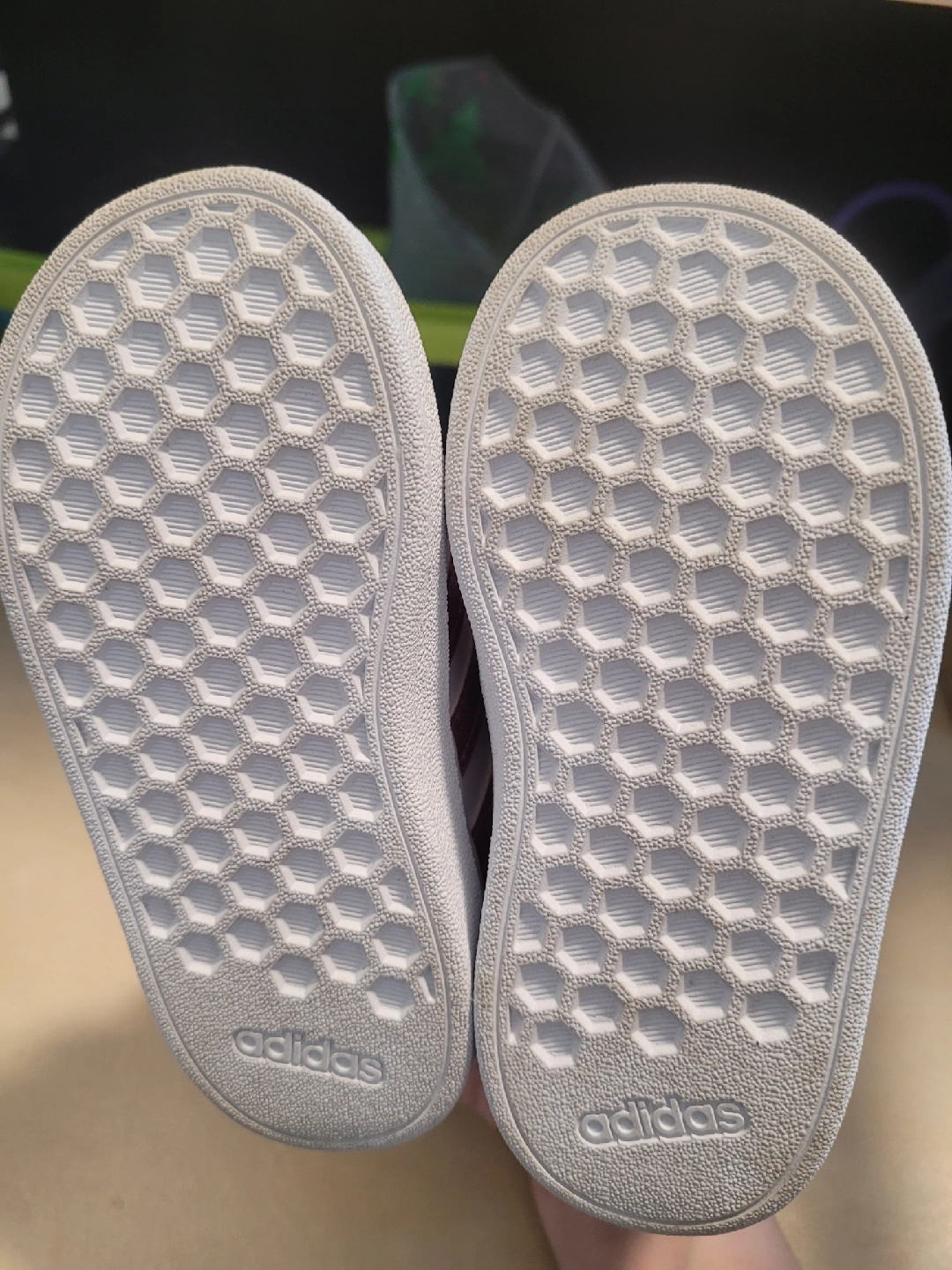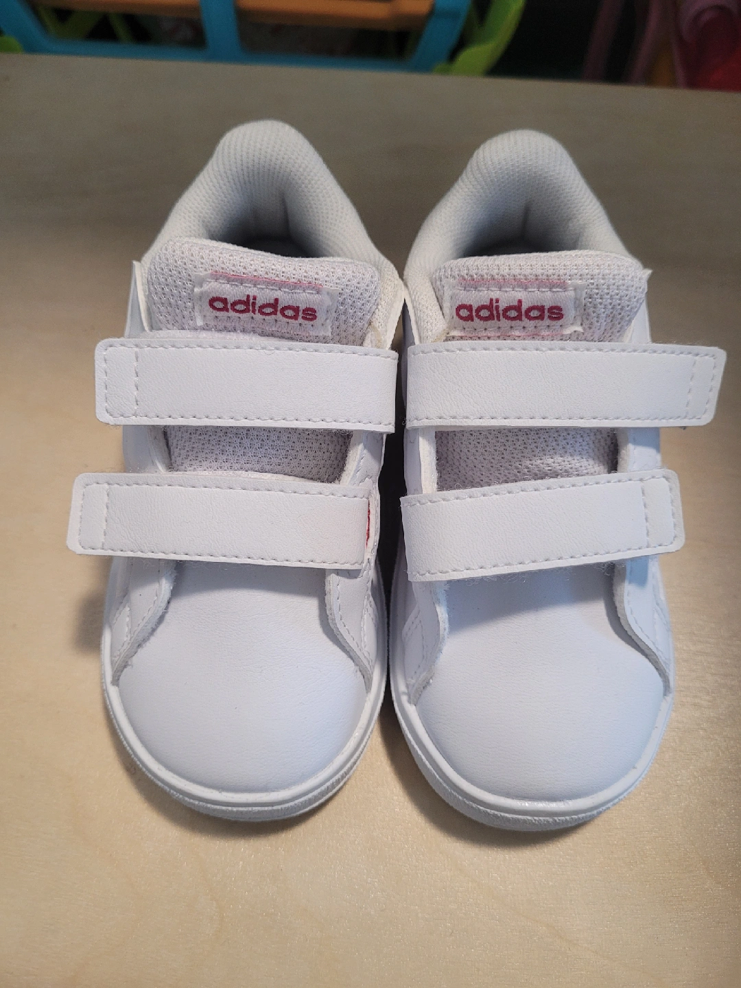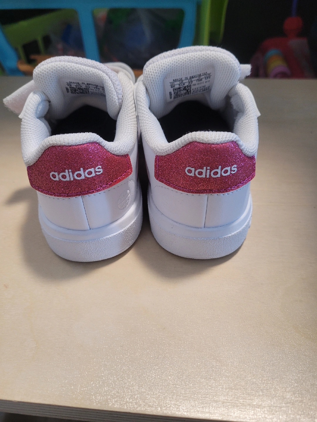These Adidas Grand Court toddler shoes are in great condition and ready for a new home! They are white with pink glitter stripes and accents. The size is 6K (US). Worn couple times around the house and backyard.
