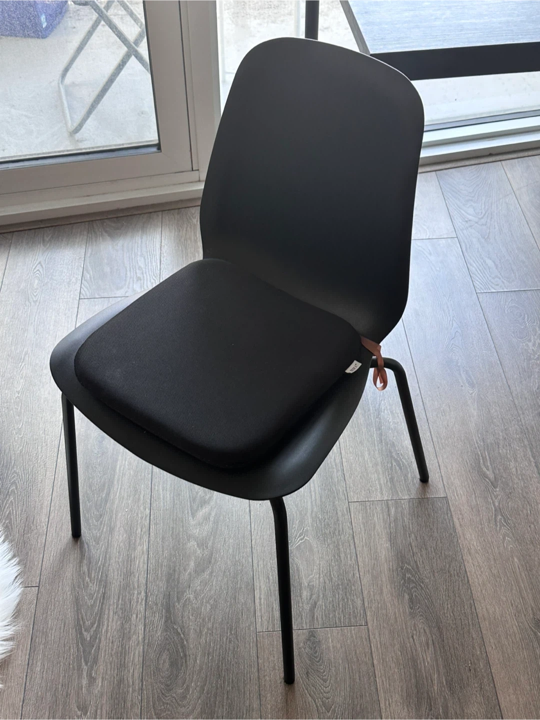 Selling a black chair that comes with a seat cushion! It's in great condition and would be perfect for a desk or dining area. The chair has a sleek, modern look with its black frame and comfortable cushion