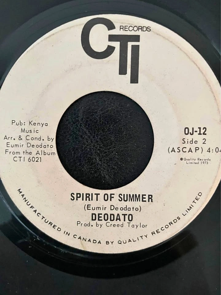 Original Canadian pressing on CTI / Quality Records (catalog OJ‑12) featuring the jazz‑funk interpretation Also Sprach Zarathustra (2001) backed by Spirit of Summer. Format: 7", 45 RPM, mono. Manufactured in Canada by Quality Records. Pickup: West Queen West, Toronto. DM for more photos or to bundle with other CTI / jazz 45s