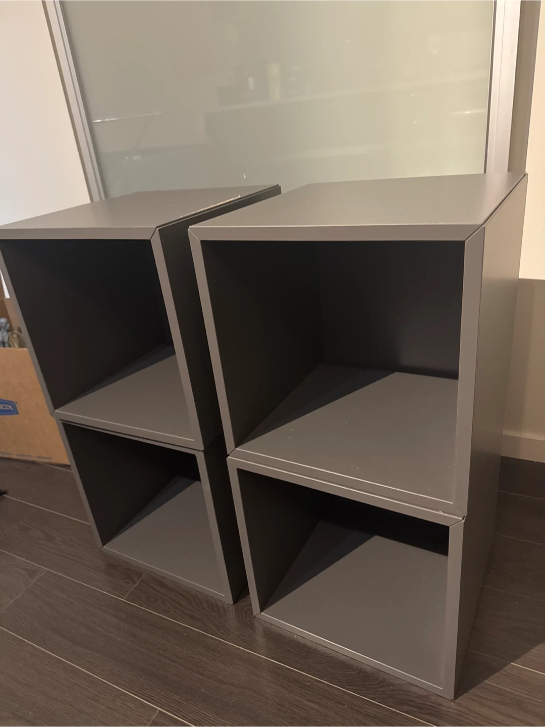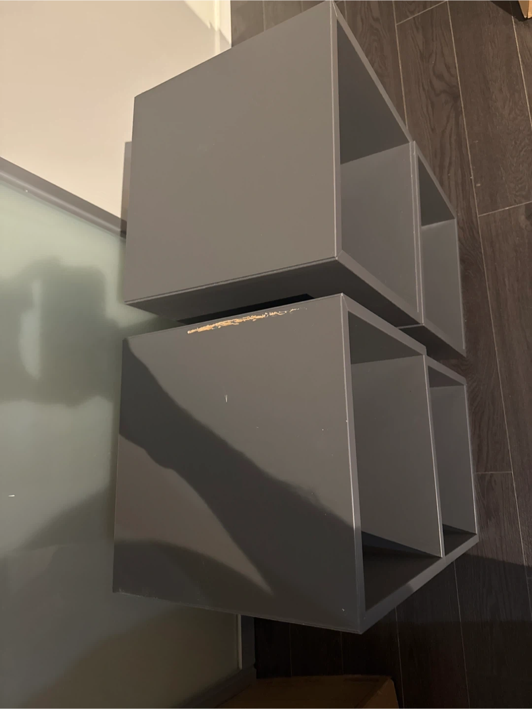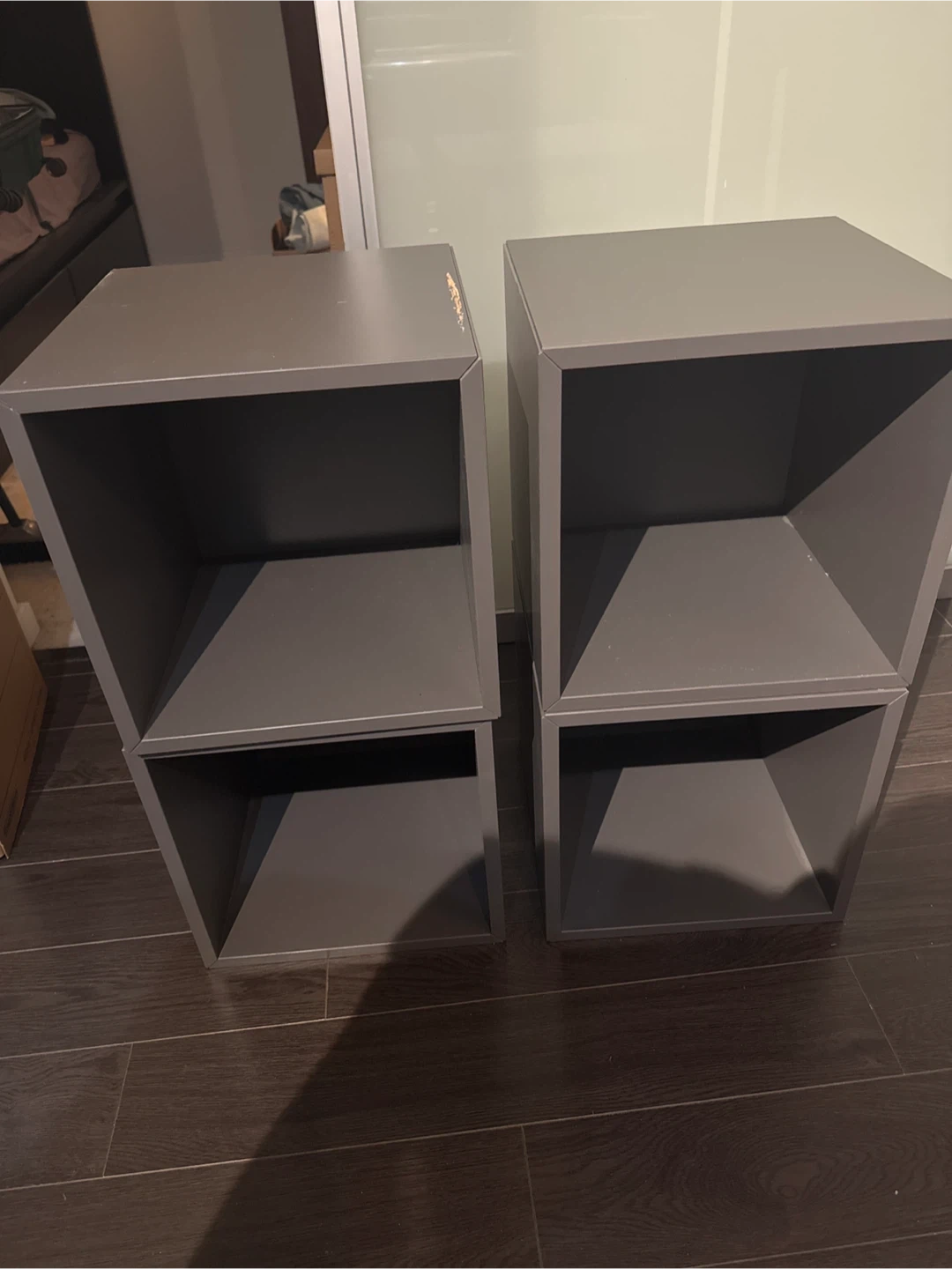 Selling a set of two grey cube storage shelves. Good for organizing your space There are some signs of wear, as shown in the photos, but they are still sturdy and functional! 4 separated units.