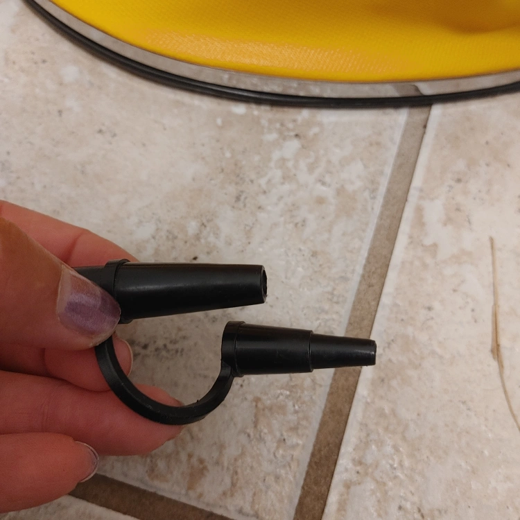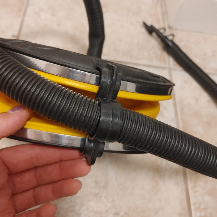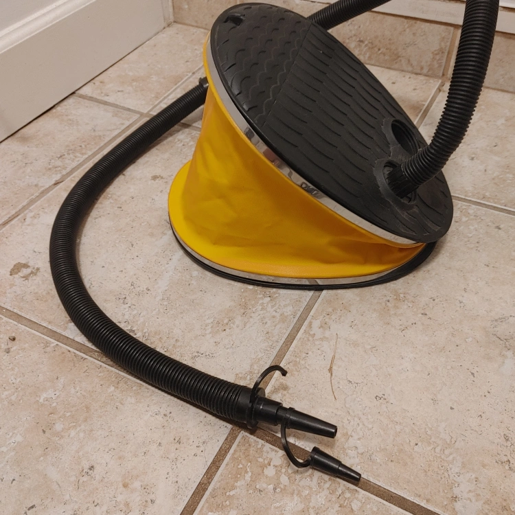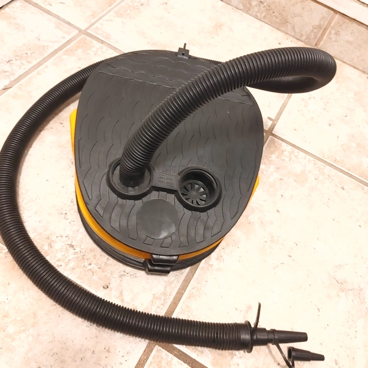 Foot air pump in yellow and black. Great for inflating various items. Comes with attachments as shown in the pictures