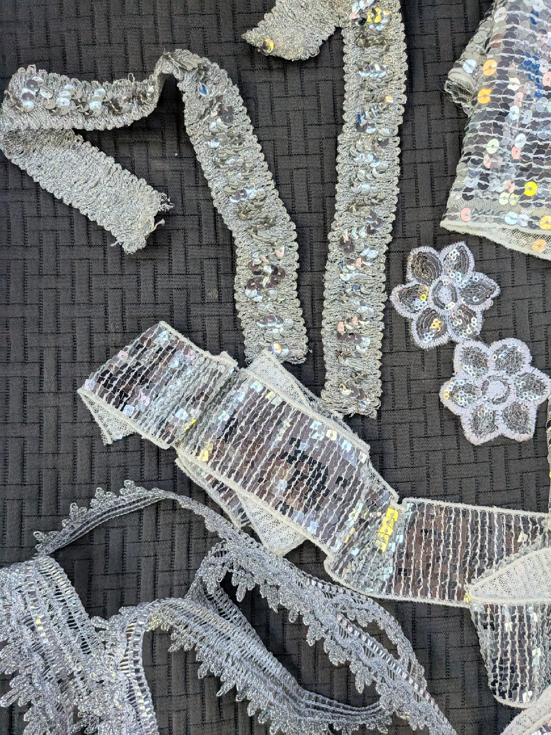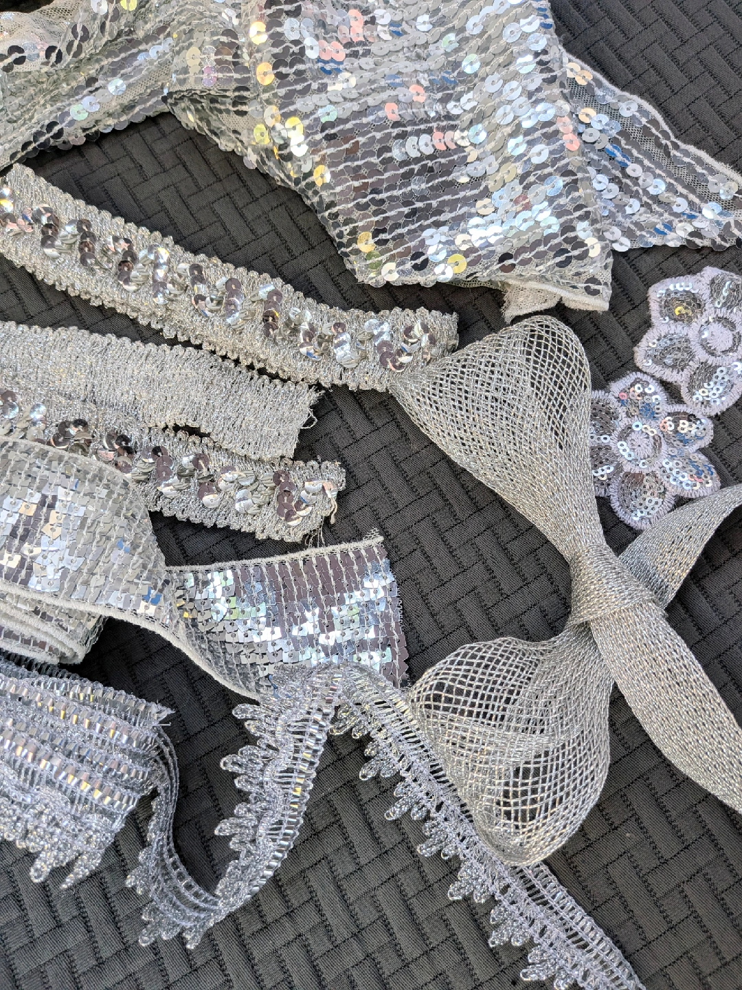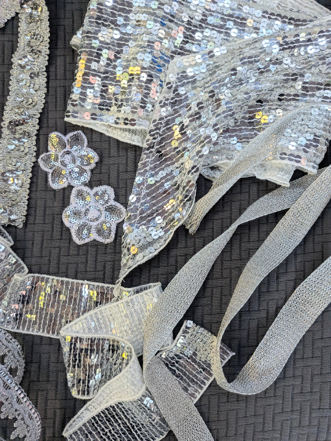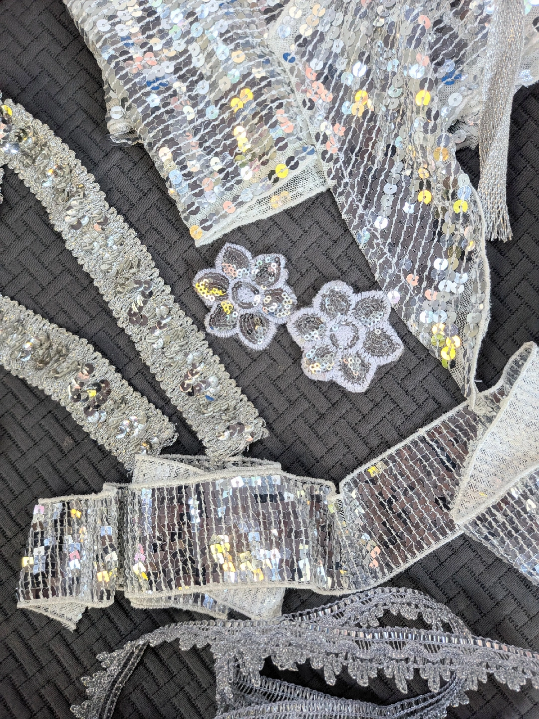 Sparkly silver vintage sequin trim and appliqués, perfect for adding some bling to your next project! Includes various styles of trim and two flower appliqués. All unused. One flower petal damaged a little. Great for crafts, costumes, or adding a little sparkle to anything Three pieces are about a yard long, two are longer Cash only, no etransfers Location: Etobicoke. Rathburn Rd and Renforth dr. Etobicoke Olympium nearby No holds, first come, first serve