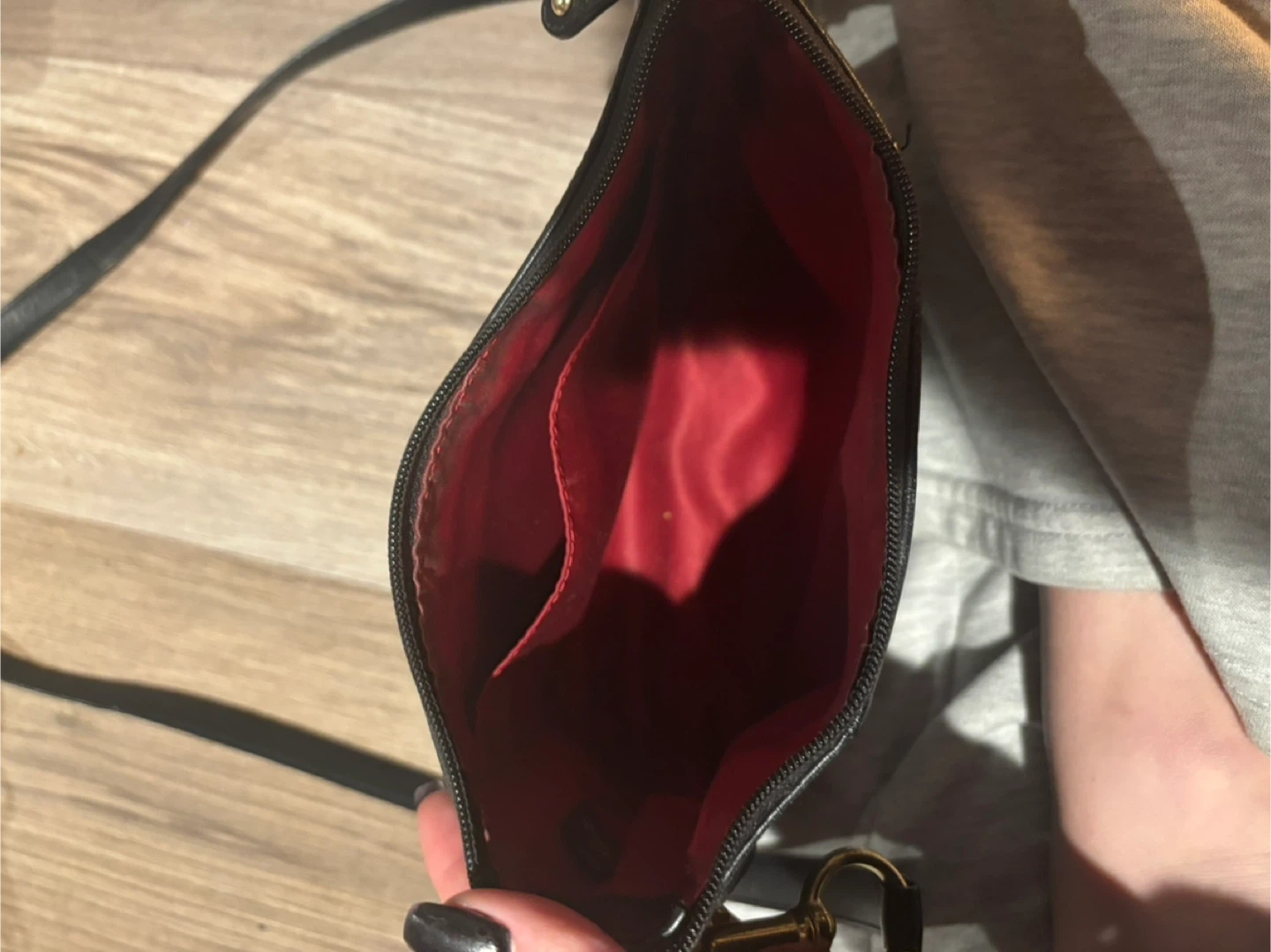 Selling a gently used Coach handbag in black leather. It's in great condition and has a lovely red lining inside. Perfect for everyday use!