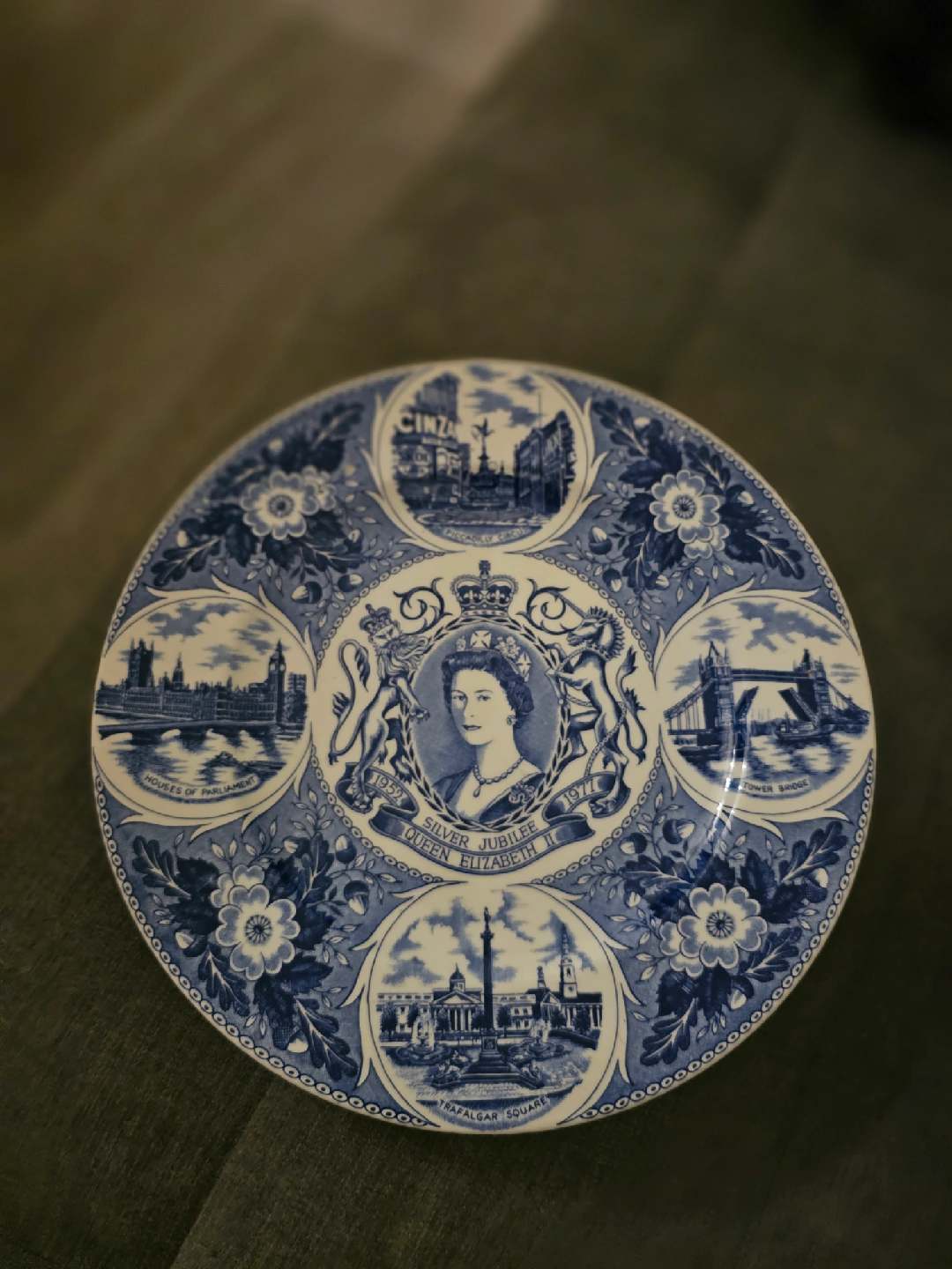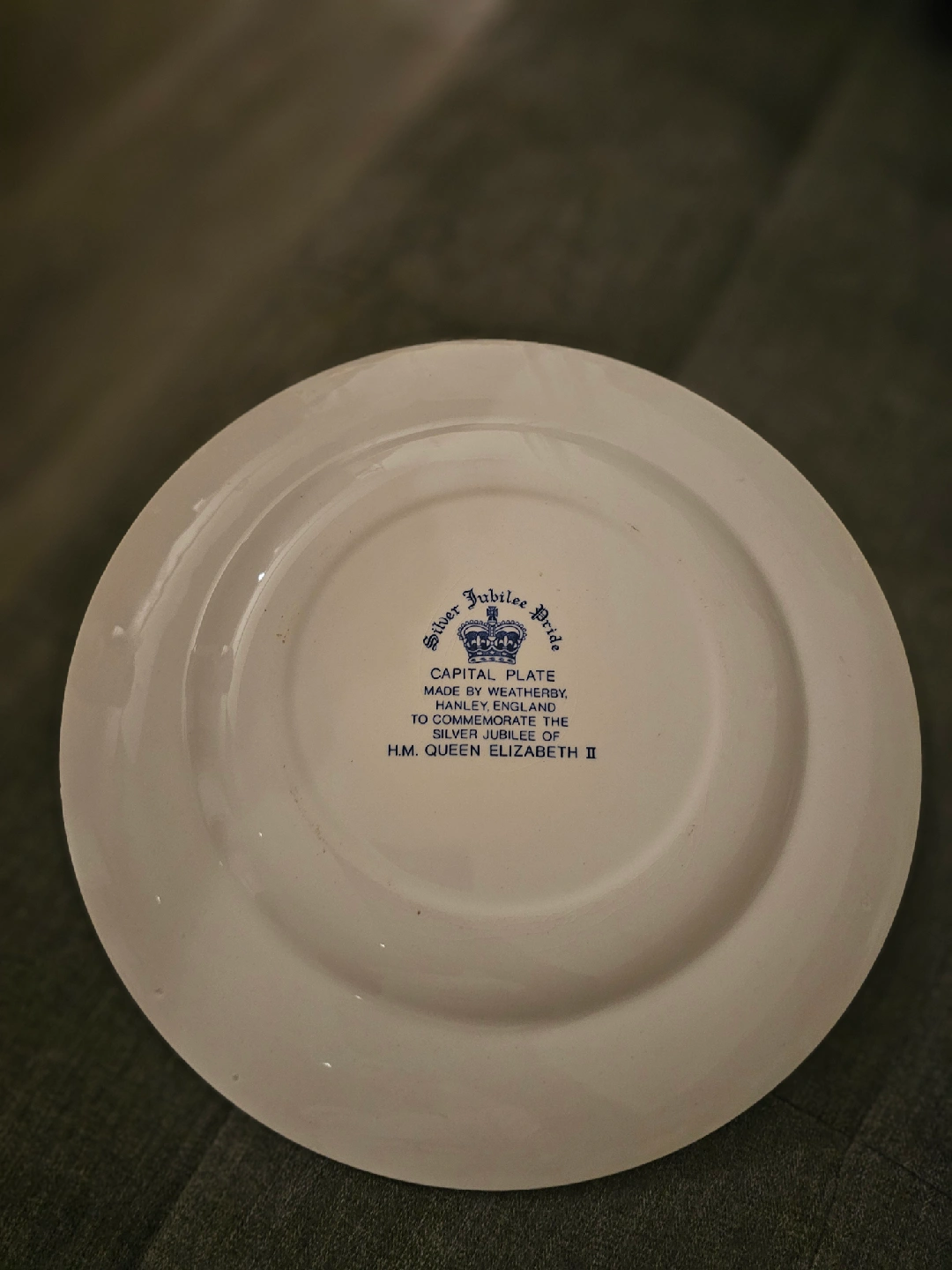 Selling a commemorative Weatherby Capital Plate celebrating Queen Elizabeth II's Silver Jubilee. This plate features iconic London landmarks and a portrait of the Queen. It's a lovely piece to add to any collection or as a decorative item for your home
