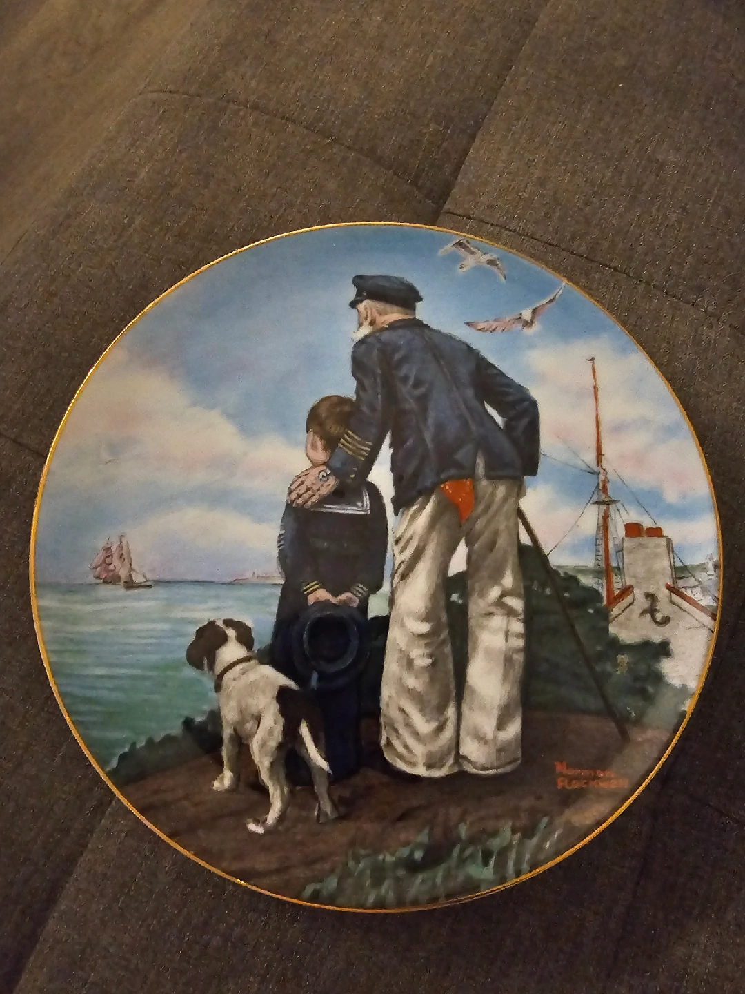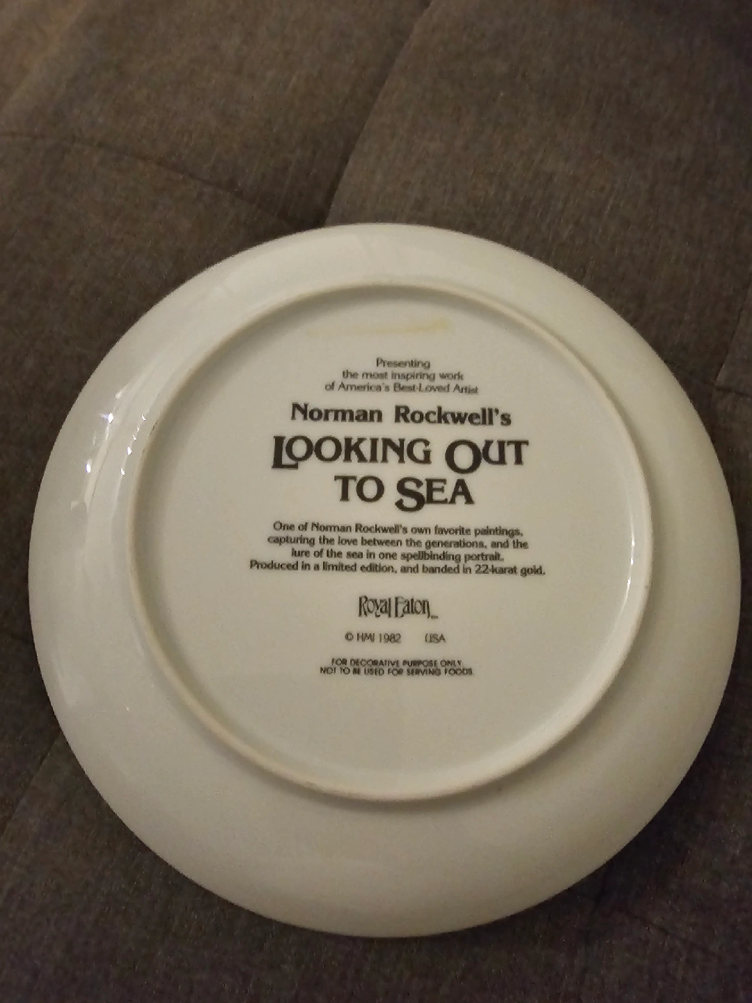 Selling a Norman Rockwell collector plate titled 'Looking Out to Sea'. This plate is produced in a limited edition and banded in 22-karat gold by Royal Eaton. It's a beautiful decorative piece!