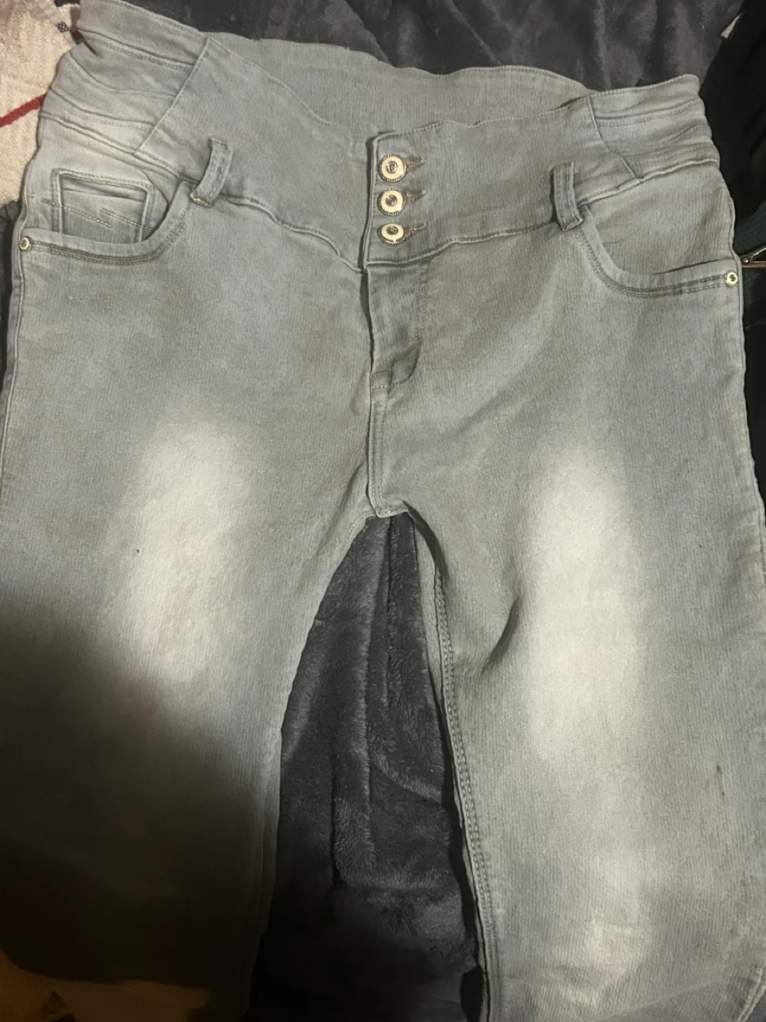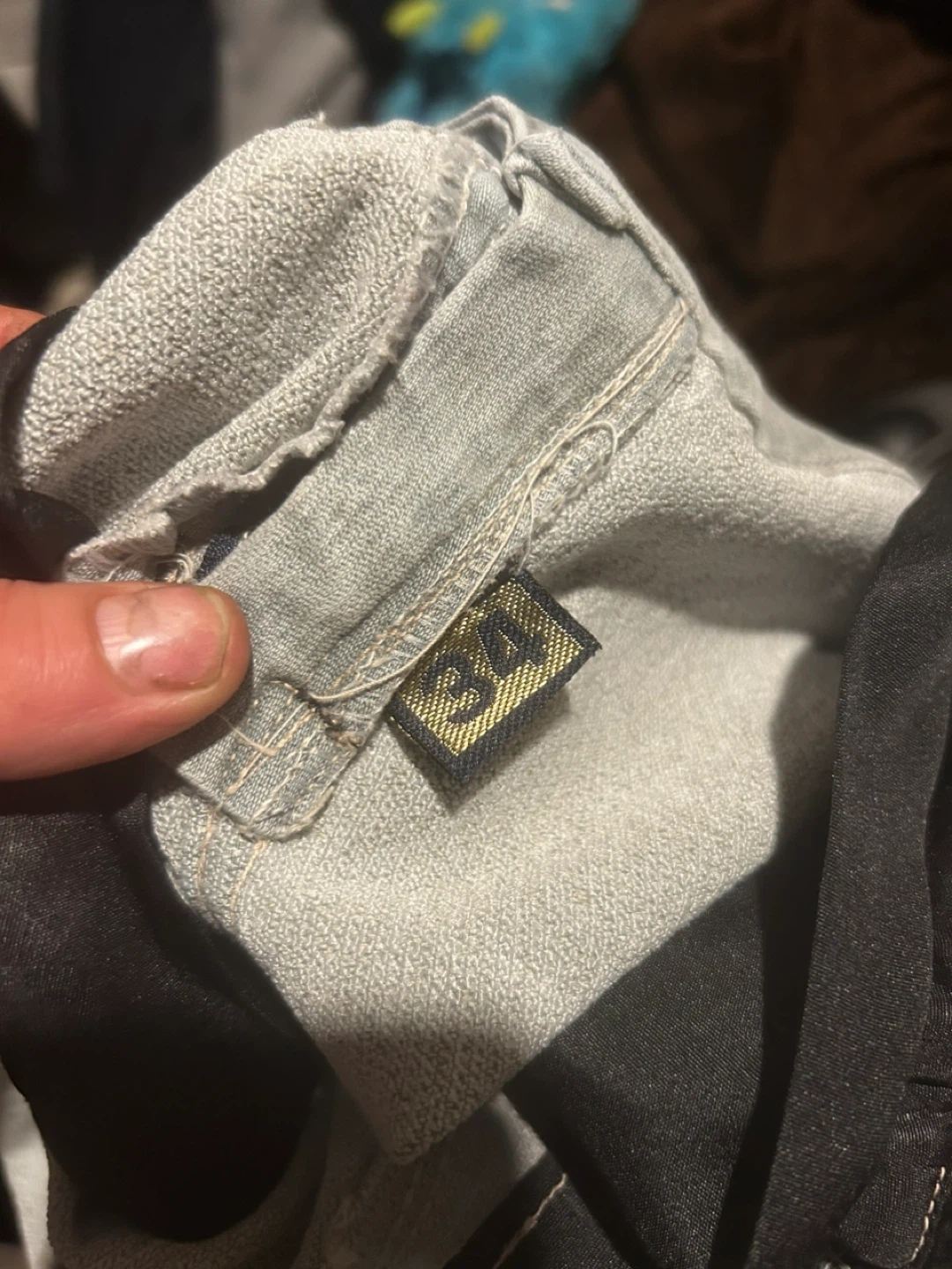 Selling a pair of Versace grey jeans in size 34 They have a unique button design and are in BRAND NEW CONDITION NEVER WORN !!! However the back butt patch got stuck on something n it ripped off :( , after I purchased I got pregnant twice and these will not fit me anymore my lose is your gain !!