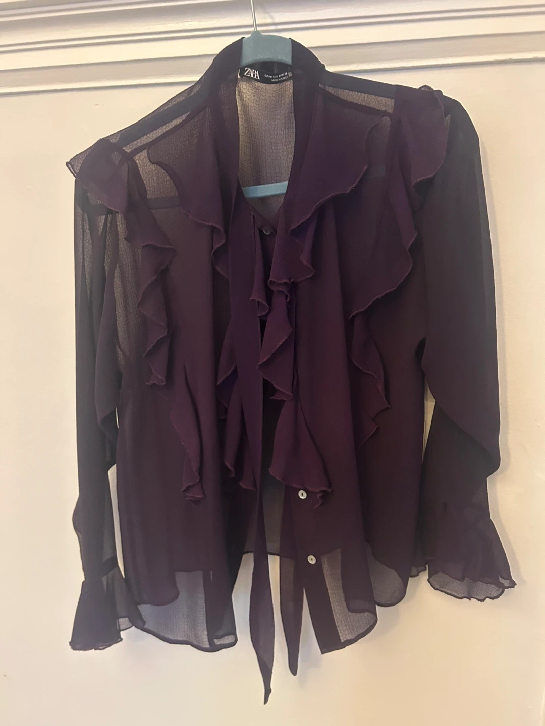 A beautiful, sheer Zara blouse in a deep purple hue! Delicate ruffles around the collar and down the front. Can be tied in bow or left open. It's a size medium. Perfect for adding a touch of elegance to any outfit! Can pick up downtown or High Park area