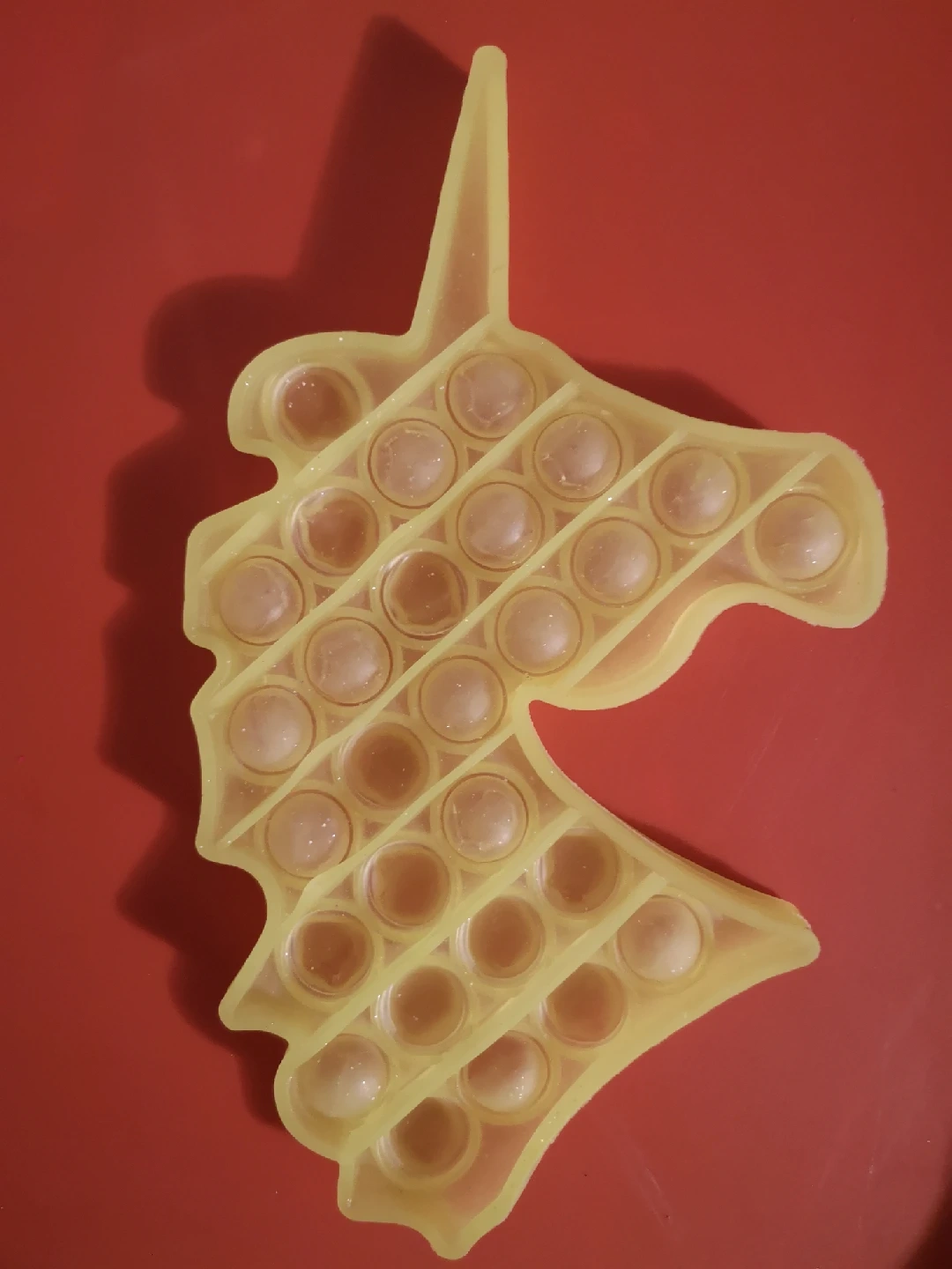 Selling a unicorn-shaped Pop It fidget toy! It's a fun and engaging sensory toy that's great for stress relief and entertainment. The toy is yellow.