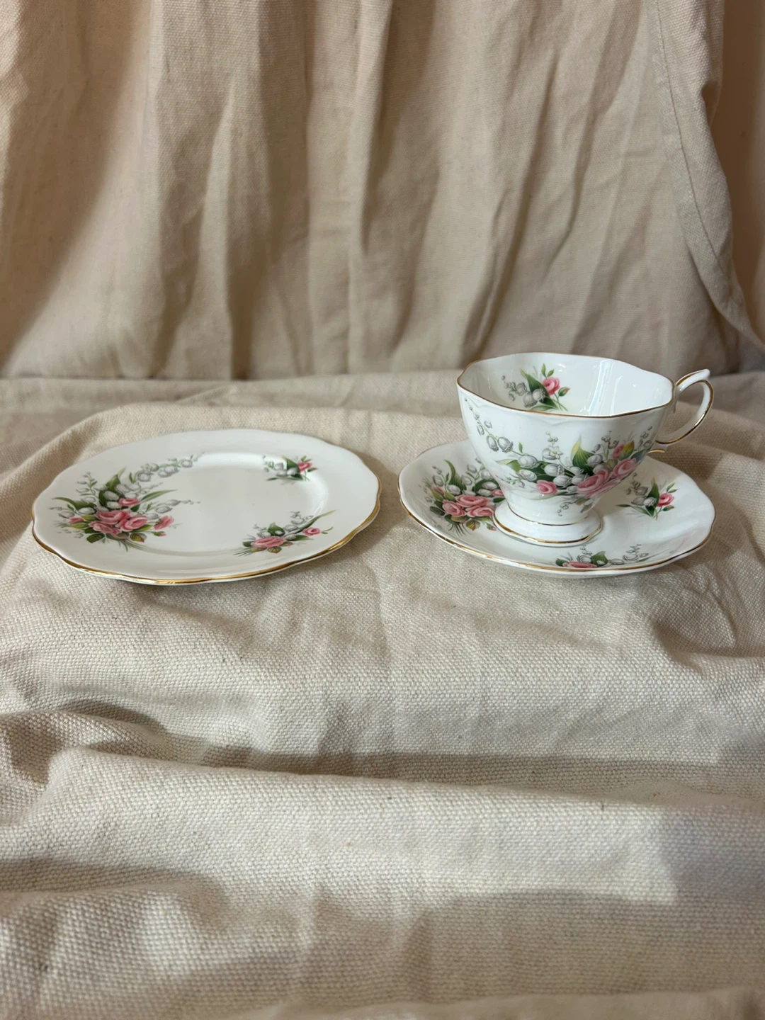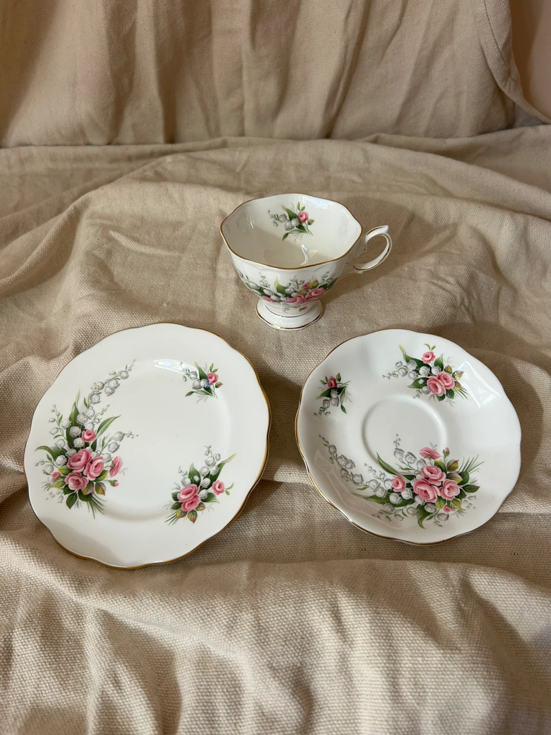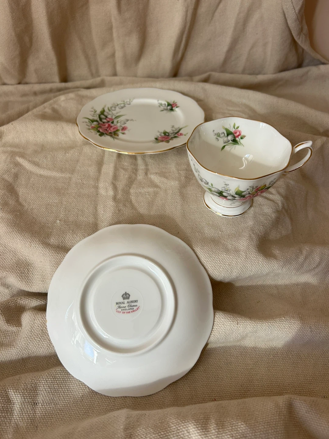 Selling a lovely Royal Albert teacup, saucer, and plate trio! The set features a delicate floral pattern with pink roses and lily of the valley, accented with gold trim. Perfect for tea parties or adding a touch of elegance to your collection