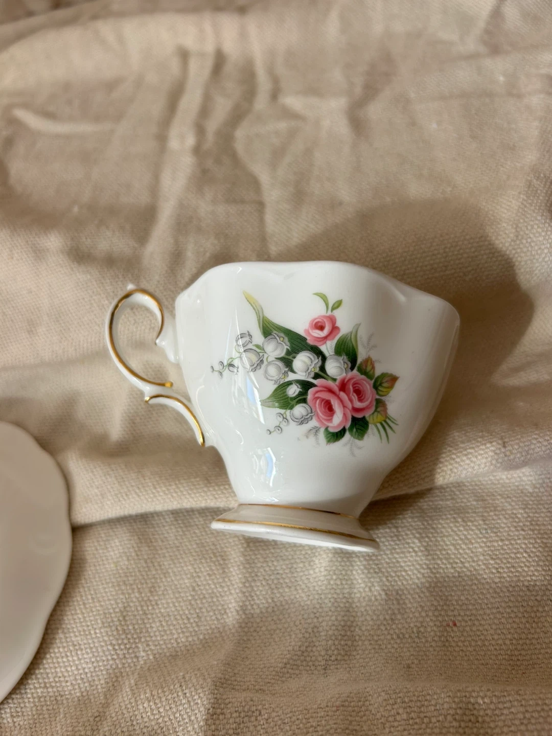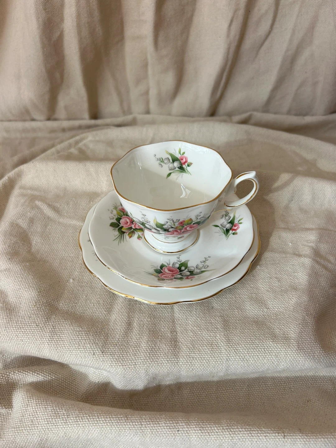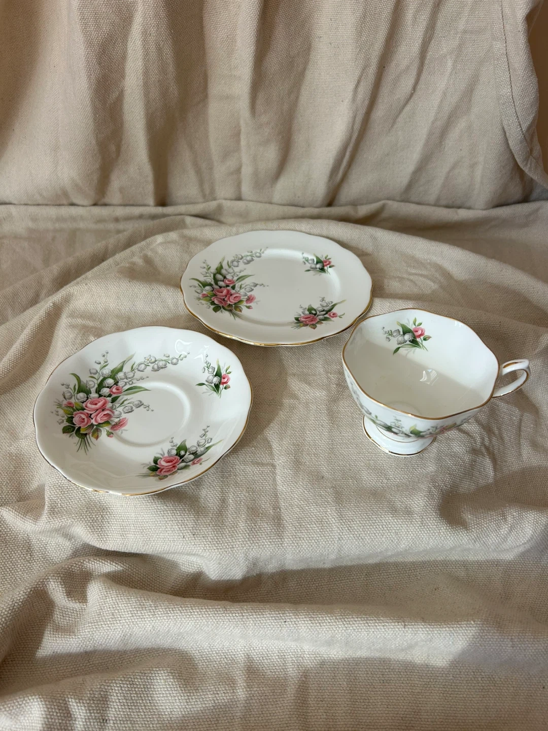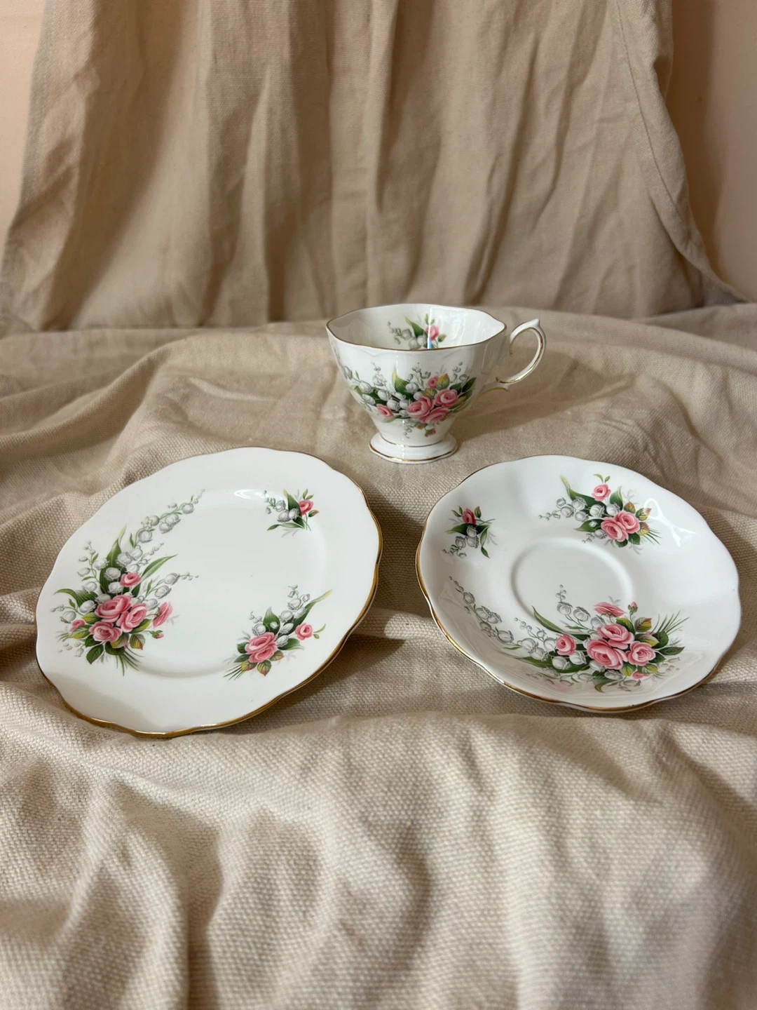 Selling a lovely Royal Albert teacup, saucer, and plate trio! The set features a delicate floral pattern with pink roses and lily of the valley, accented with gold trim. Perfect for tea parties or adding a touch of elegance to your collection