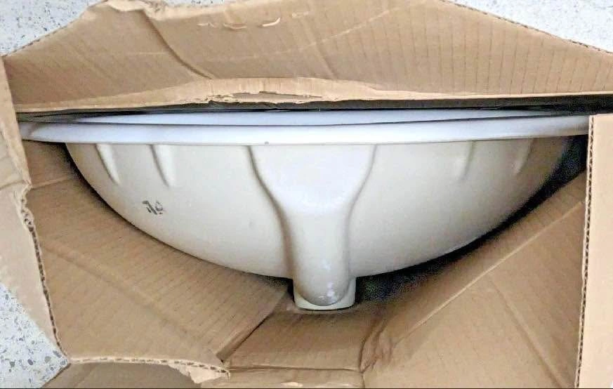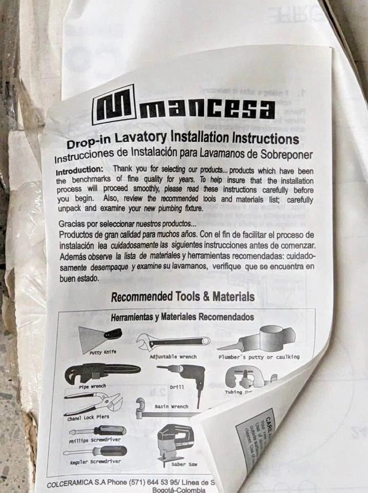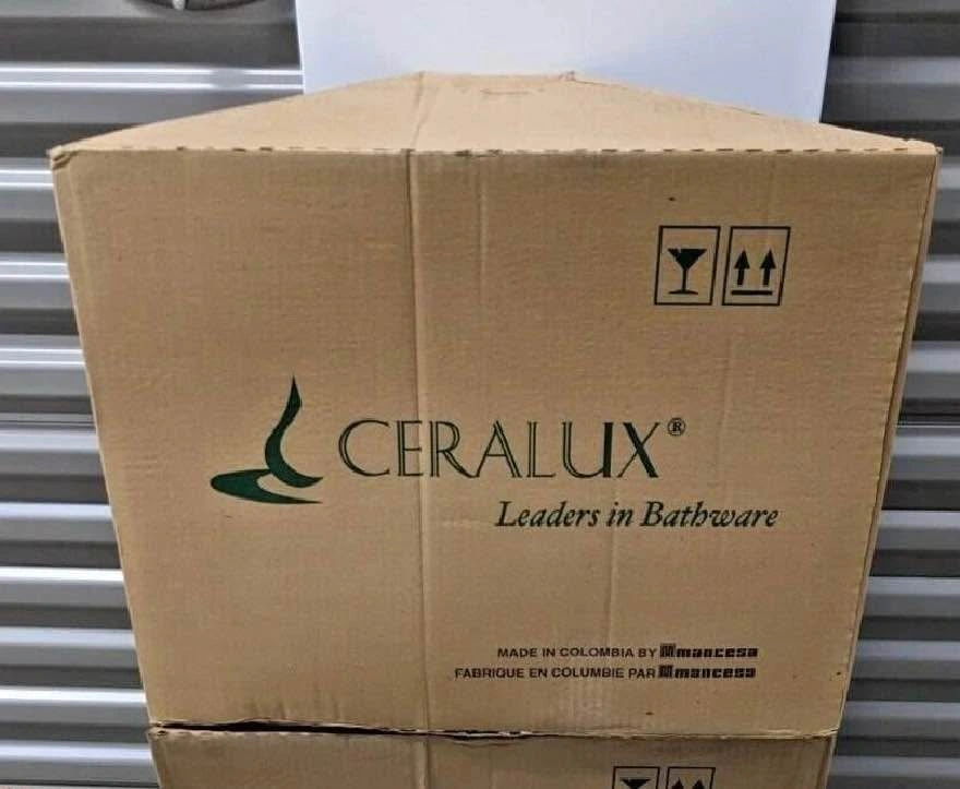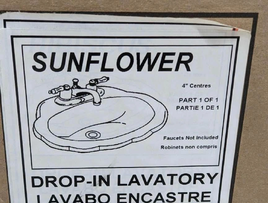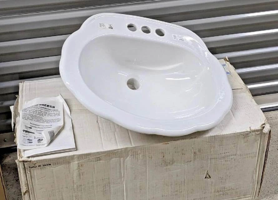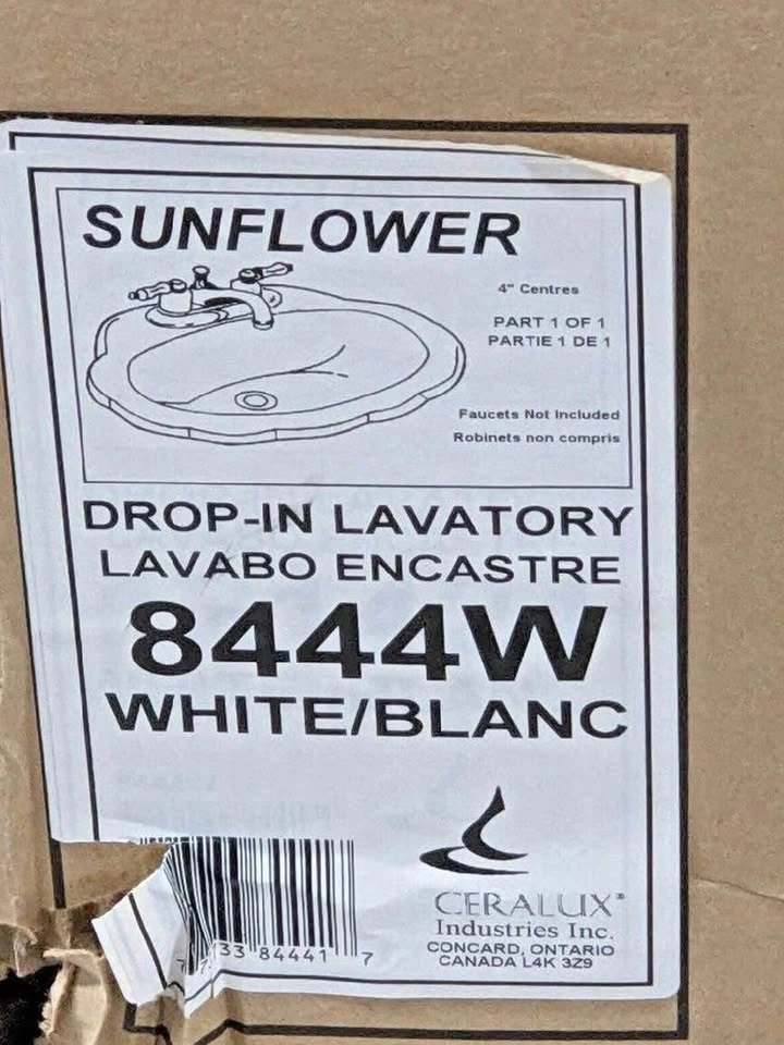 NEW $238 Ceralux Sunflower model 8444W white drop-in lavatory sink. Made in Colombia by Mancesa for Ceralux. Designed with three faucet holes on 4-inch centers. Includes original packaging and installation instructions. Faucets not included. Featuring a scalloped edge design, it is suitable for drop-in installations. Box shows signs of wear, but sink appears unused. 5pcs - 150$ each
