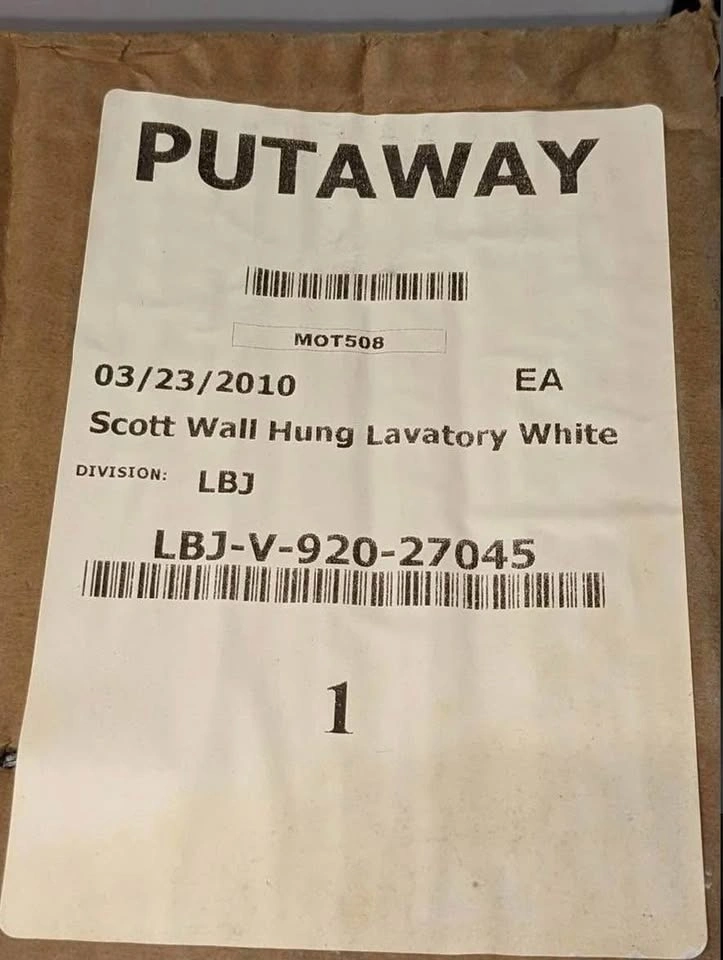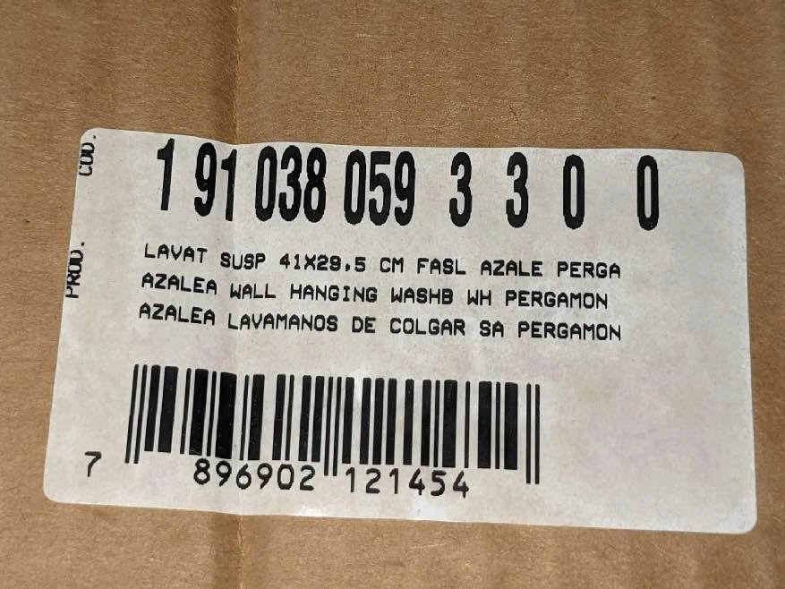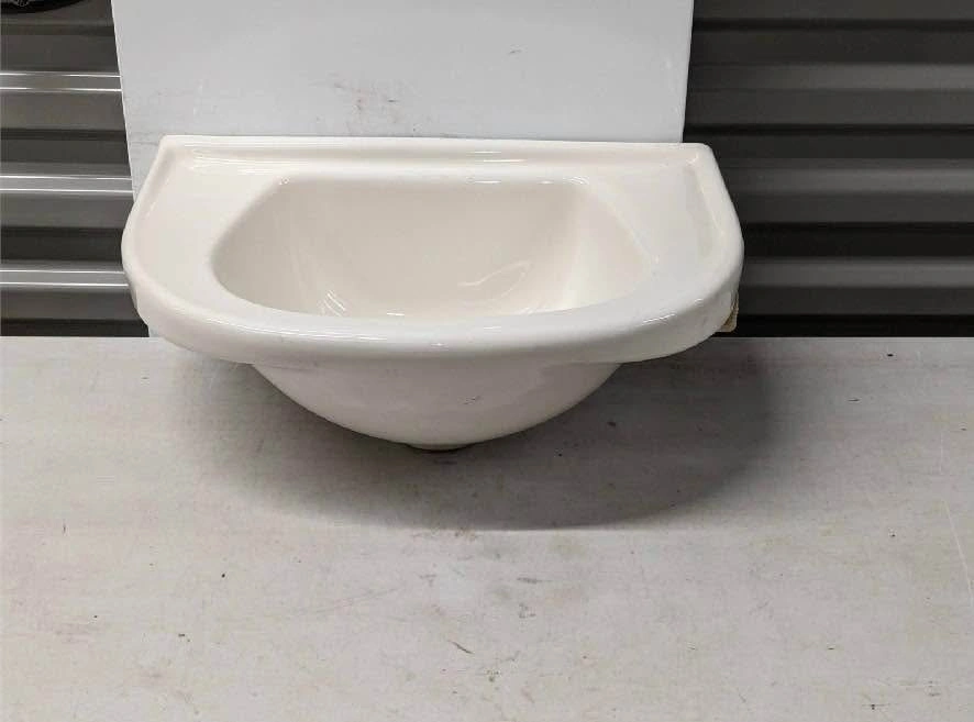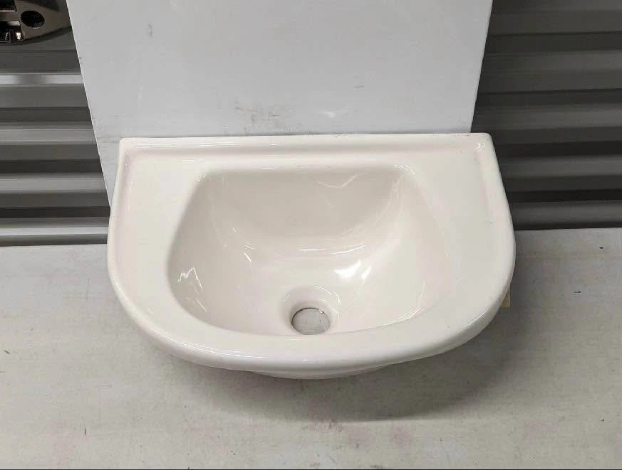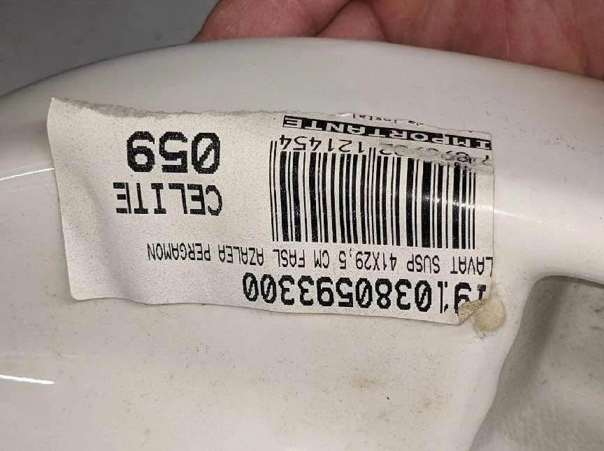 New wall-hung lavatory sink by Scott, featuring a white finish. Model label indicates dimensions 41 x 29.5 cm. Made for wall mounting, suitable for bathrooms or powder rooms.