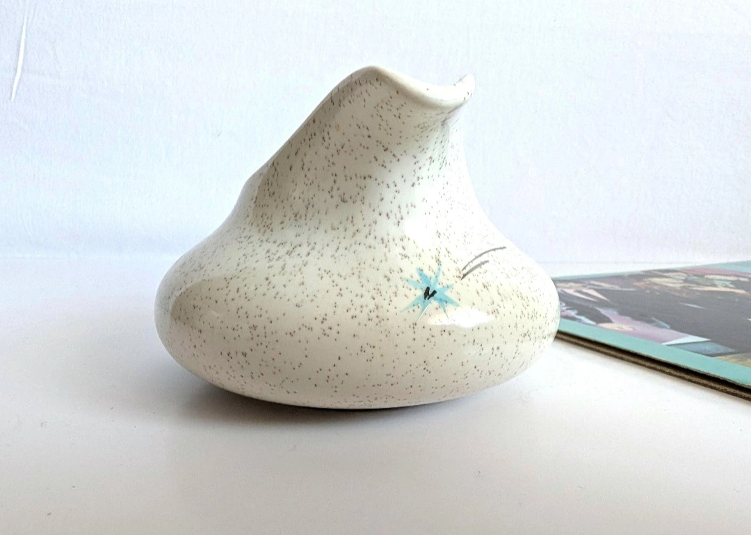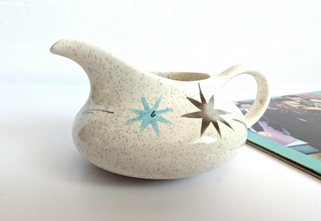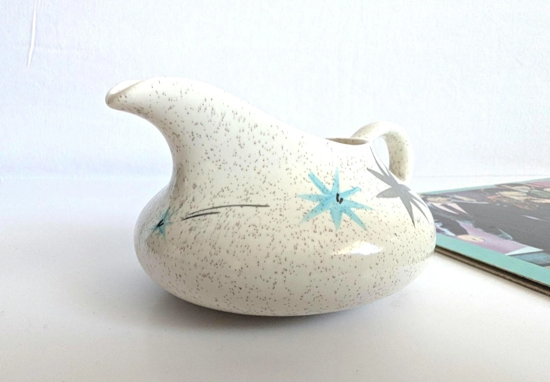 Myott creamer pot. Safari - Silent Night pattern. Speckled stoneware with turquoise and silver starbursts. Measures approximately 2.75 inches in height, from bottom to spout. Holds approximately 6 fluid ounces. Good vintage condition. Excellent retro vibe. π PICK UP TOWNLINE HWY 2 AREA π CASH is preferred please π Thanks for looking π©΅