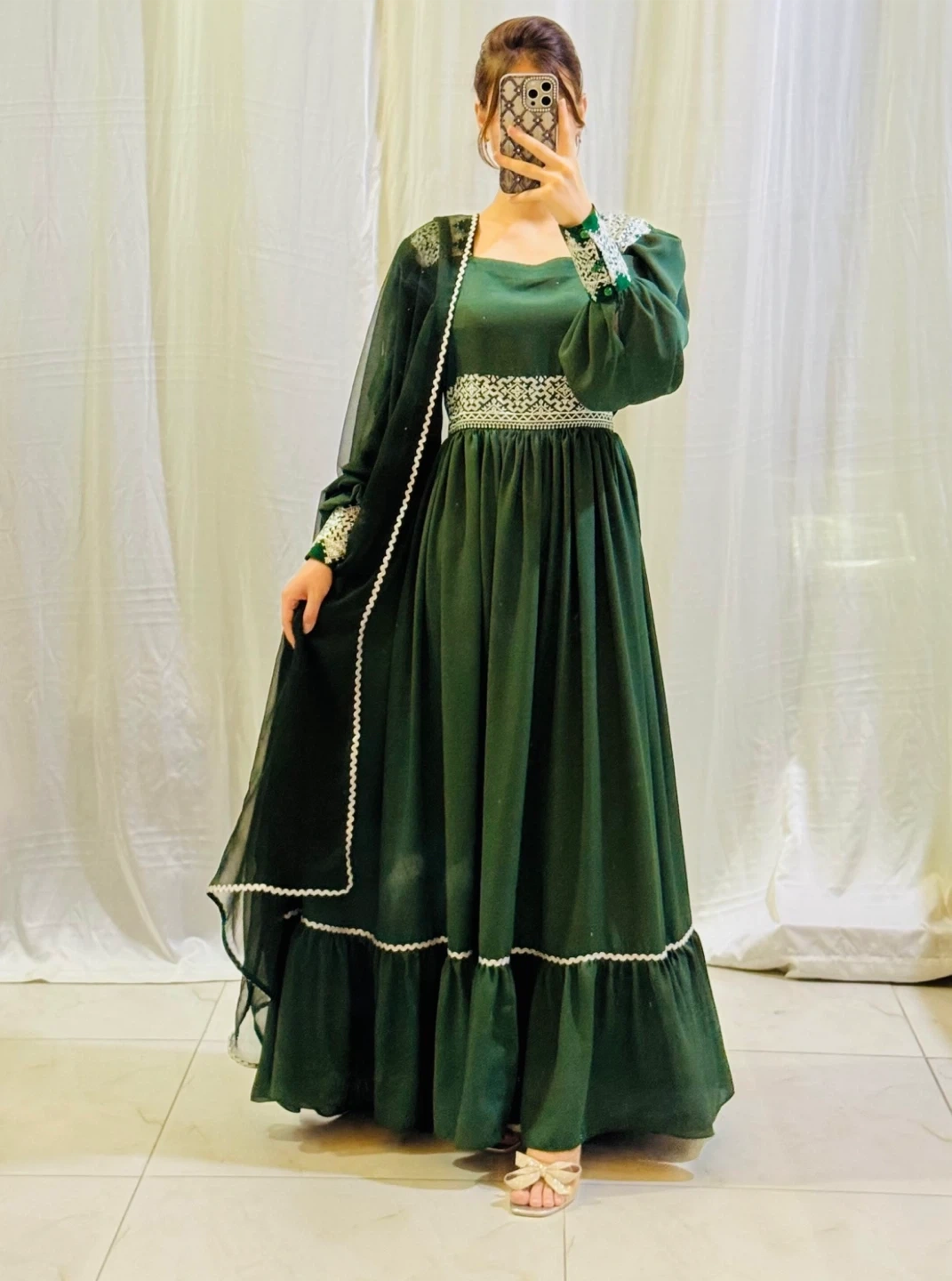 A beautiful green dress with long sleeves and a flowing skirt. It features delicate detailing around the waist and cuffs. Perfect for a special occasion or a stylish everyday look!
