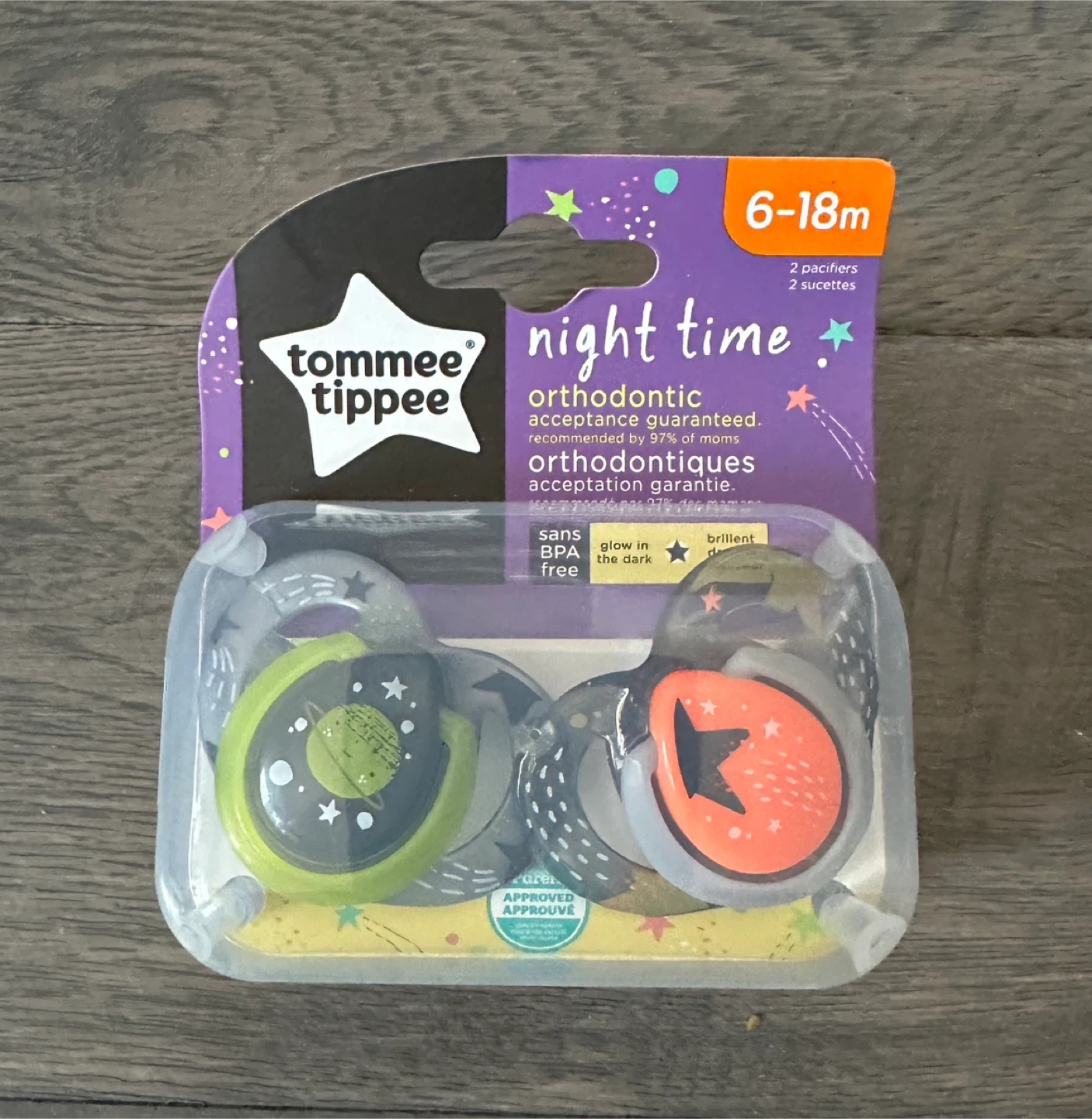 I have a brand new pack of Tommee Tippee Night Time orthodontic pacifiers, recommended for babies aged 6-18 months. They glow in the dark, making them easy to find at night! BPA free.
