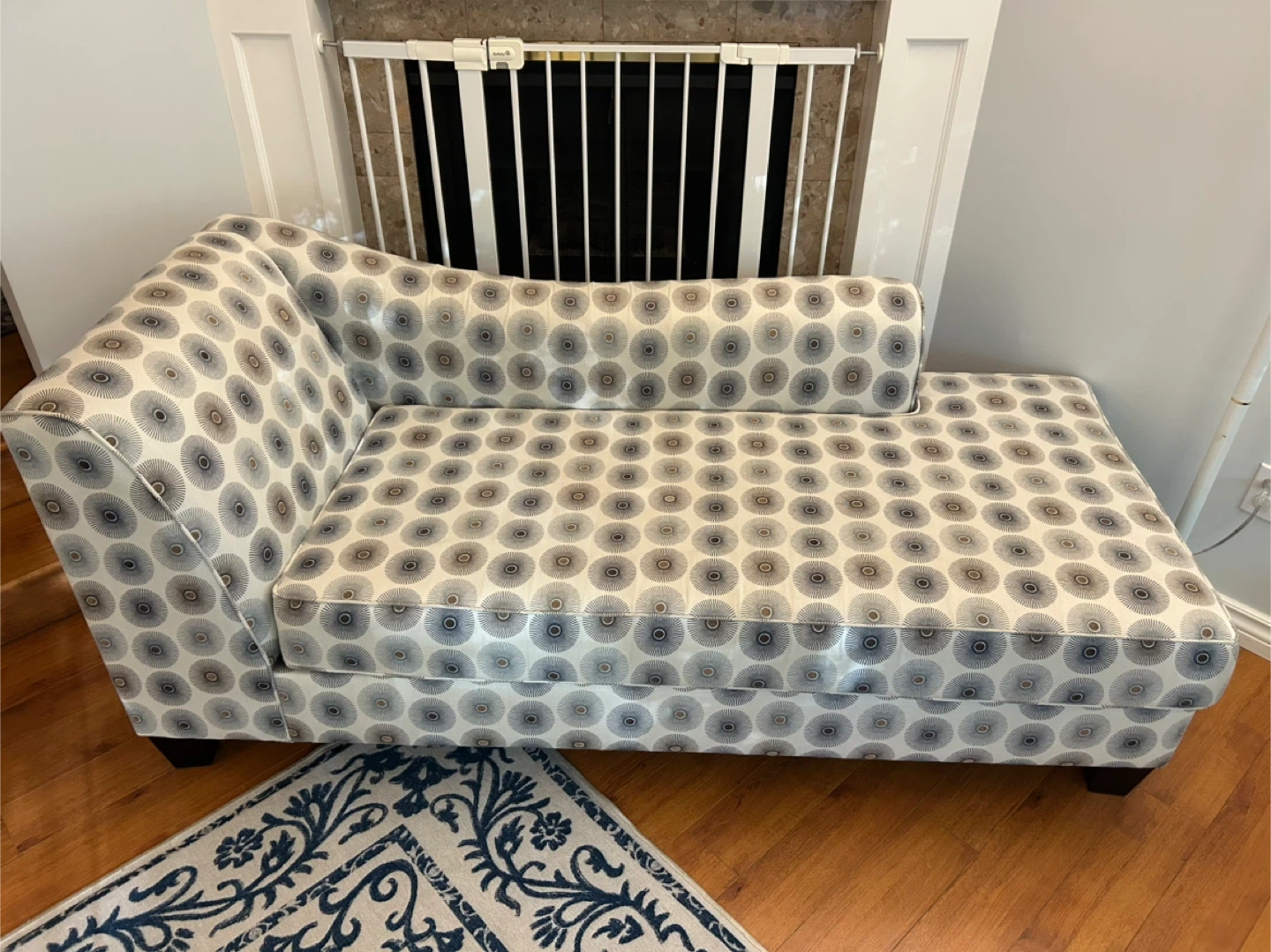 Here's a stylish chaise lounge with a unique patterned design! It's perfect for adding a touch of elegance to any room. The neutral colour palette makes it easy to match with existing decor. It's in great condition and ready for a new home