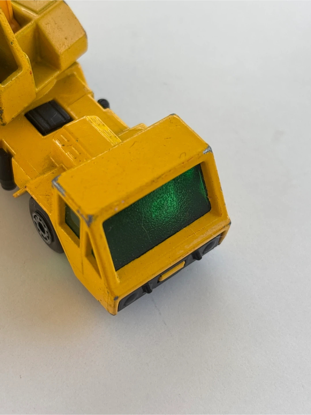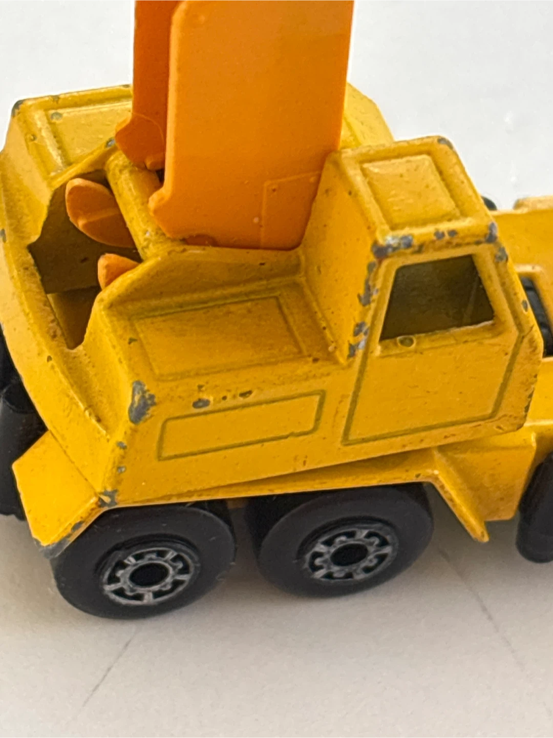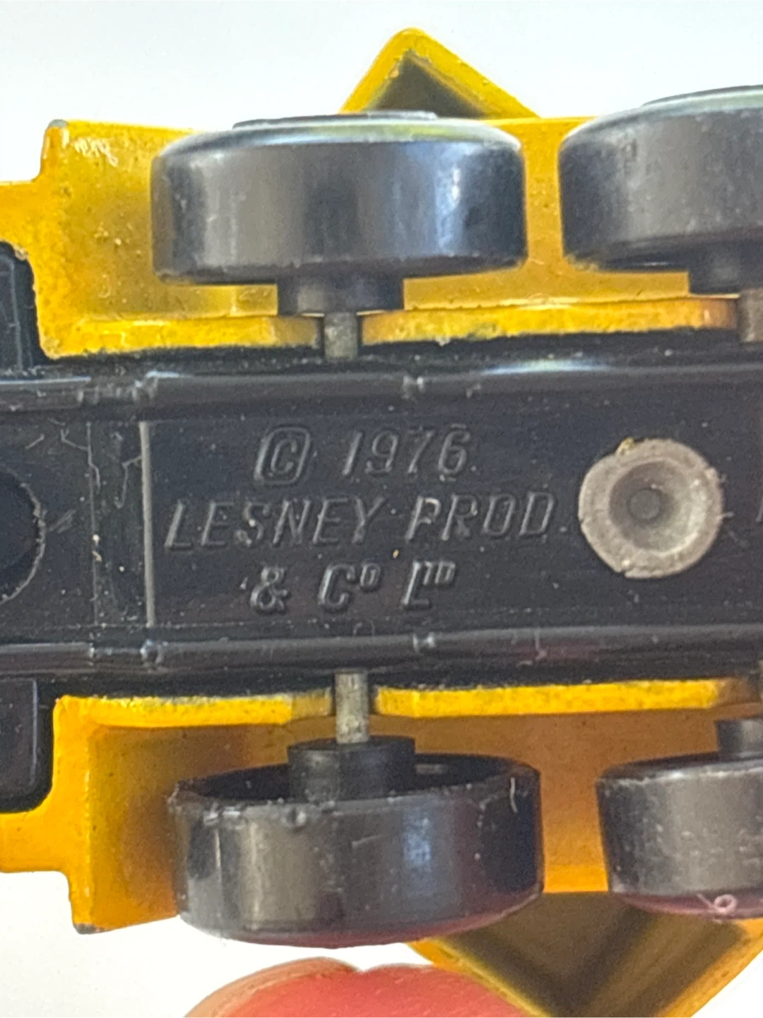 Selling a vintage Lesney crane truck toy! It's yellow and shows some signs of wear, adding to its charm. The base is marked © 1976 Lesney Prod. & Co Ltd. Perfect for collectors or anyone who loves classic toys!