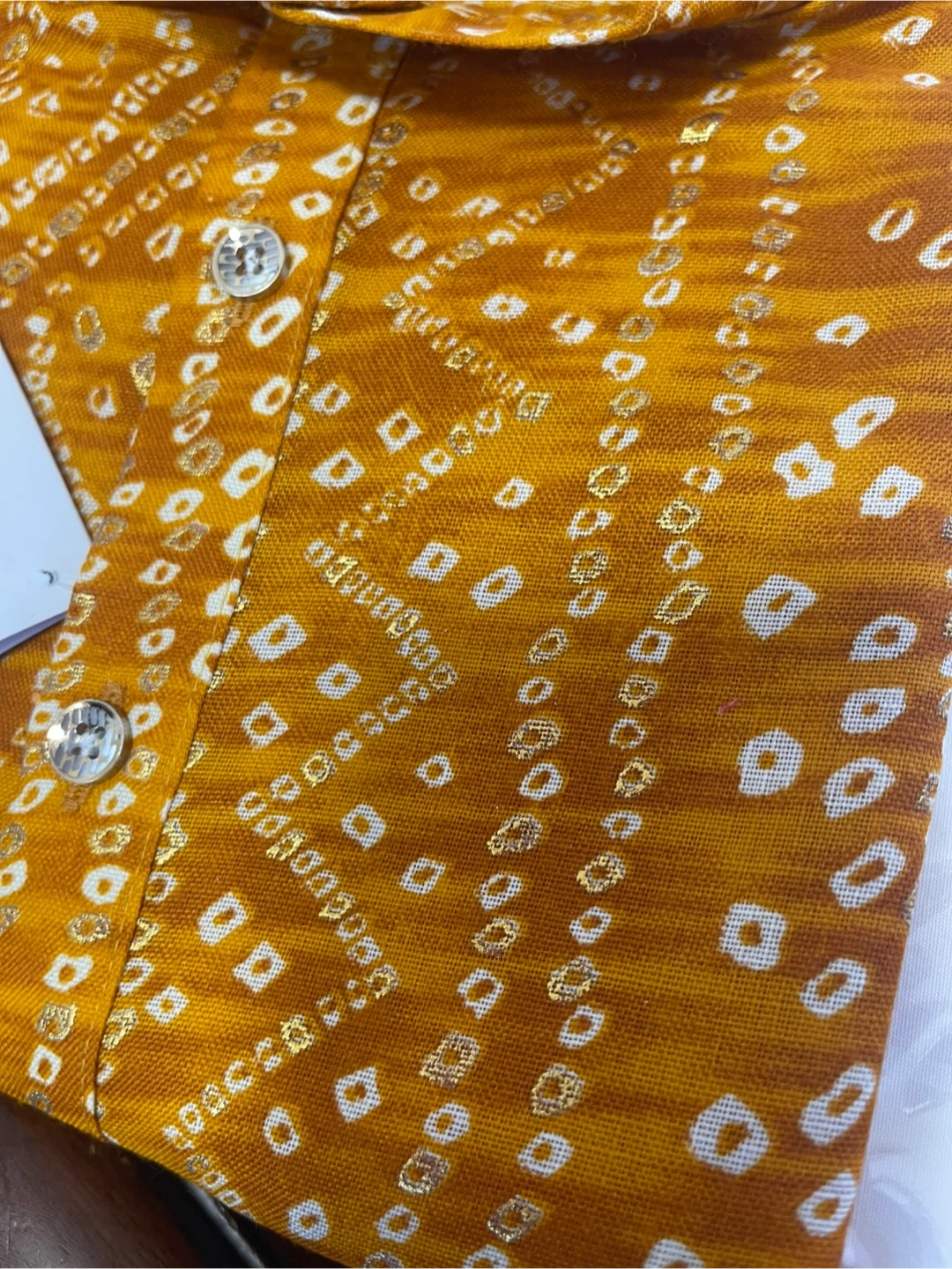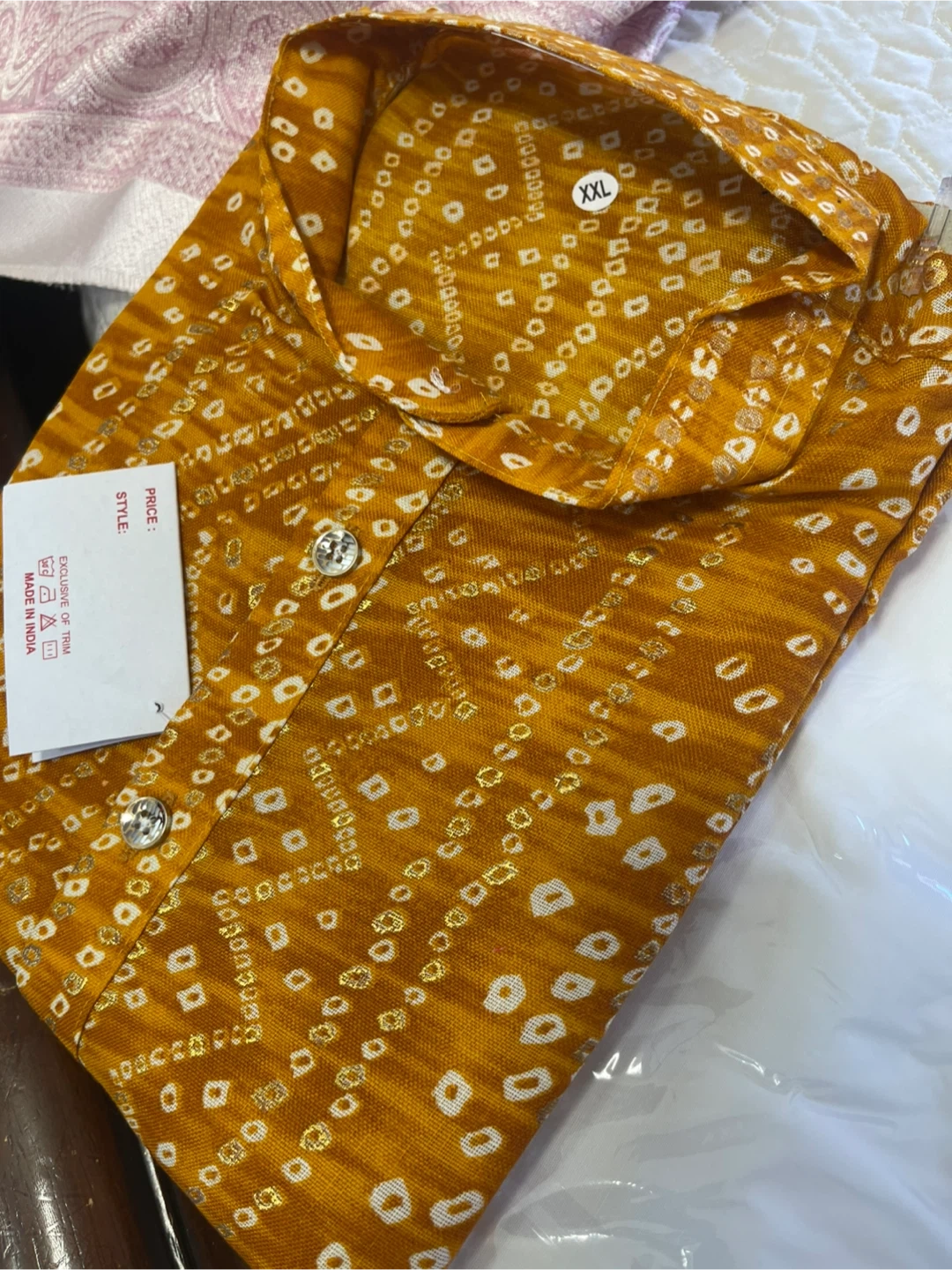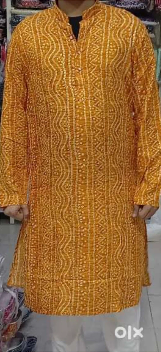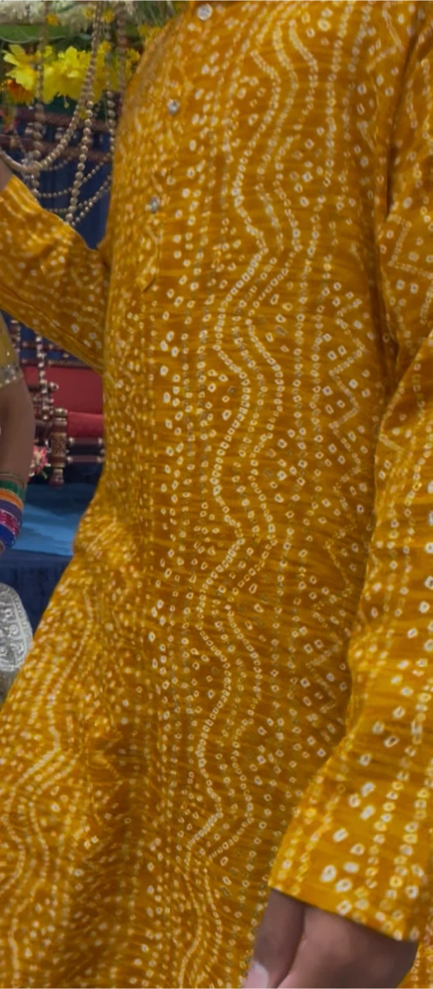 Selling a yellow bandhani kurta in size XXL. It's a beautiful piece with intricate detailing, perfect for festive occasions or everyday wear. The fabric is comfortable and breathable. It's in great condition!