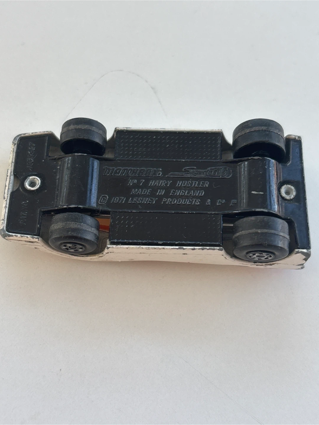 Selling a vintage Matchbox Lesney No. 7 Hairy Hustler car from 1971! It's a cool piece of toy car history. Made in England by Lesney Products & Co. This one has been well-loved, so it shows some signs of wear and tear