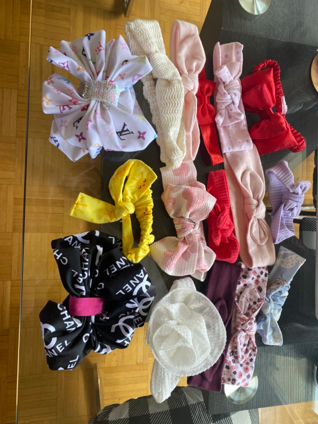 A cute collection of baby headbands! There are several different styles and patterns, including ones with a Louis Vuitton-inspired print and a Chanel-inspired print. Perfect for your little one!