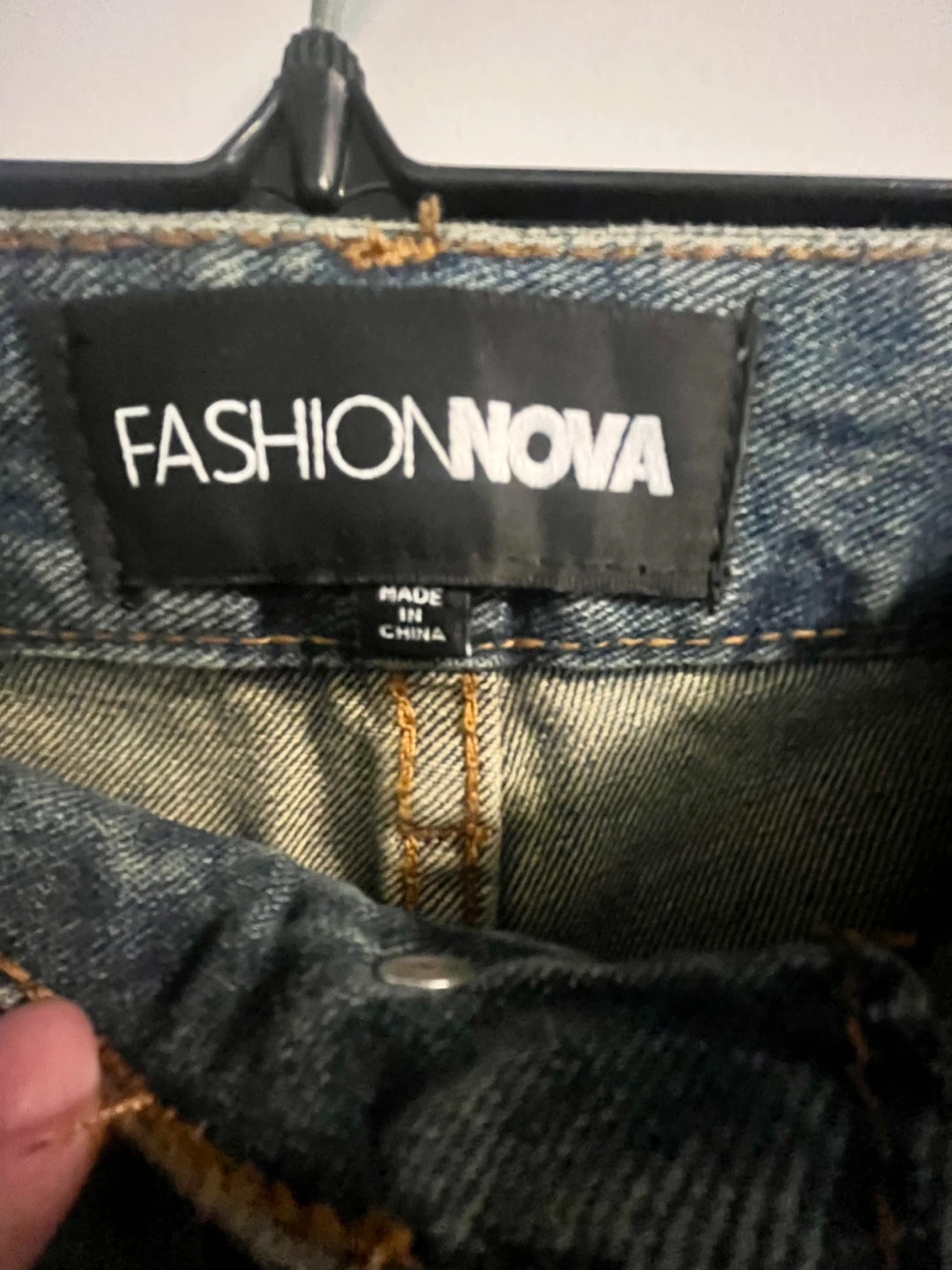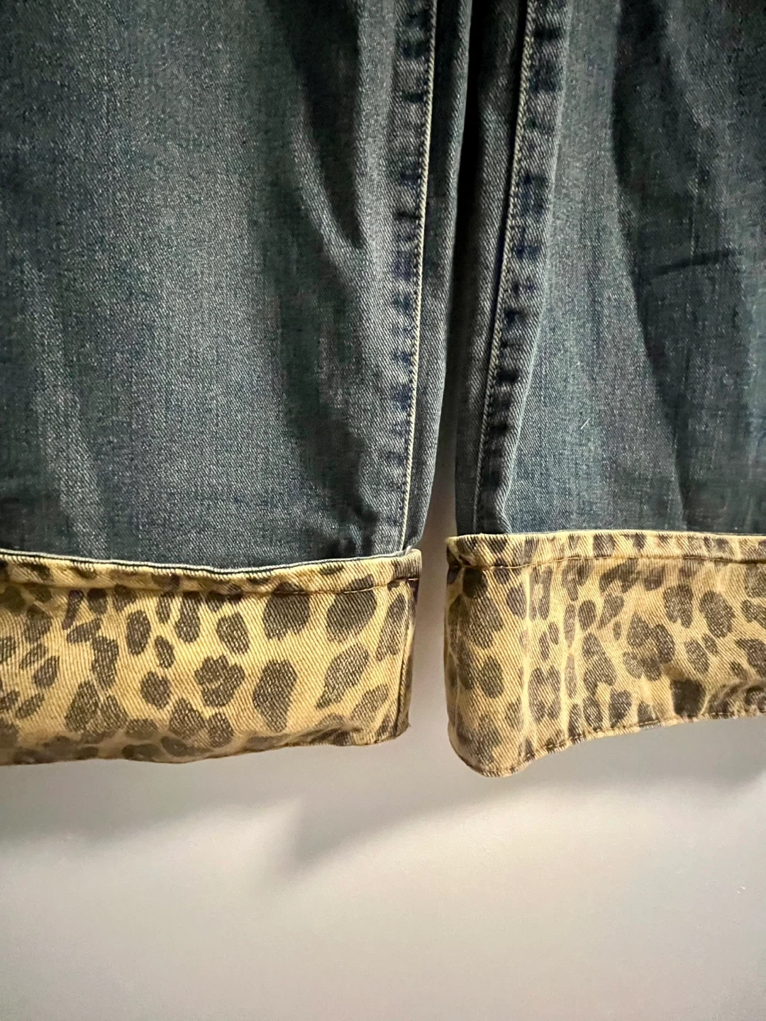 Selling a pair of Fashion Nova wide leg jeans. They are blue denim with a leopard print cuff. Great for a trendy look! Pickup downtown and cash only!