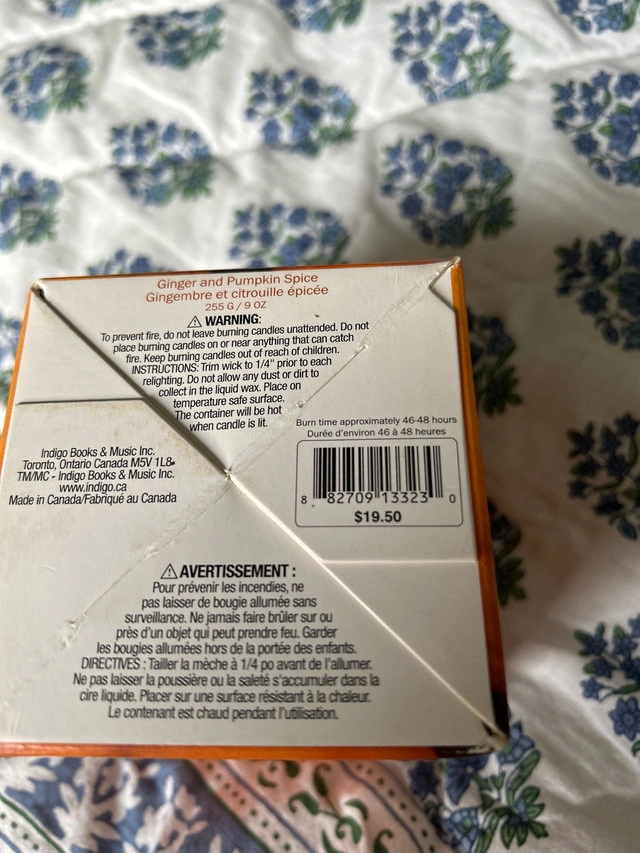 Ginger and pumpkin spice scent. Originally $19.50 from Indigo. Has not been burned.